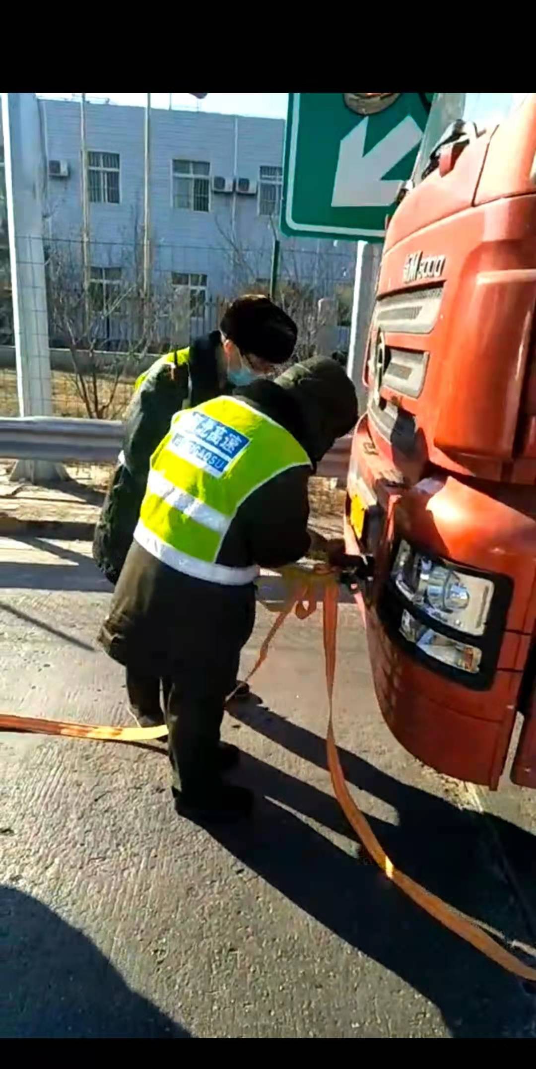 正在等待领卡上高速的过程中,集装箱司机发现车辆突然无法正常启动,打不着火了。集装箱货车司机是东北人,对这里丝毫不熟悉,并且他所拉货物必须在指定时间拉载到指定港口。在万分焦急之中,当班班长孙建伟和疏导员张励伟及时出现。了解情况后,孙建伟询问集装箱司机车上是否携带拖车绳,考虑先将车拖出车道外,再考虑找附近的维修师傅帮助维修。当提到“拖车绳”三个字的时候,集装箱司机师傅显得更加惊慌着急。孙建伟赶紧说:“您别着急,我们这里有,我去给你拿。”孙建伟立刻到便民服务台取出拖车绳。孙建伟和张励伟两个人一起帮助集装箱司机师傅将拖车绳捆扎在车头位置,并劝说处在车道前方位置的司机伸出援助之手,将拖车绳的另外一端绑在其车上。前方司机欣然应允。在外力的作用下,集装箱车辆顺利启动着火。孙建伟和集装箱司机确认车辆能够正常行驶后,挥手告别,重返工作岗位。
