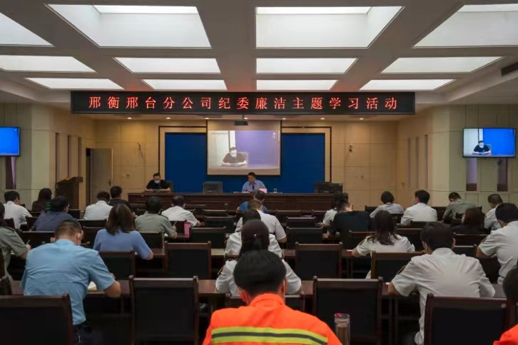 廉洁主题学习活动,首先由邢衡邢台分公司纪委书记武军平上“学党史 讲廉洁”专题党课,其次集体观看警示教育视频《正风反腐在身边》,再次由纪检监督室主任阴哲带领大家集中学习廉洁知识,最后进行廉洁知识答题。