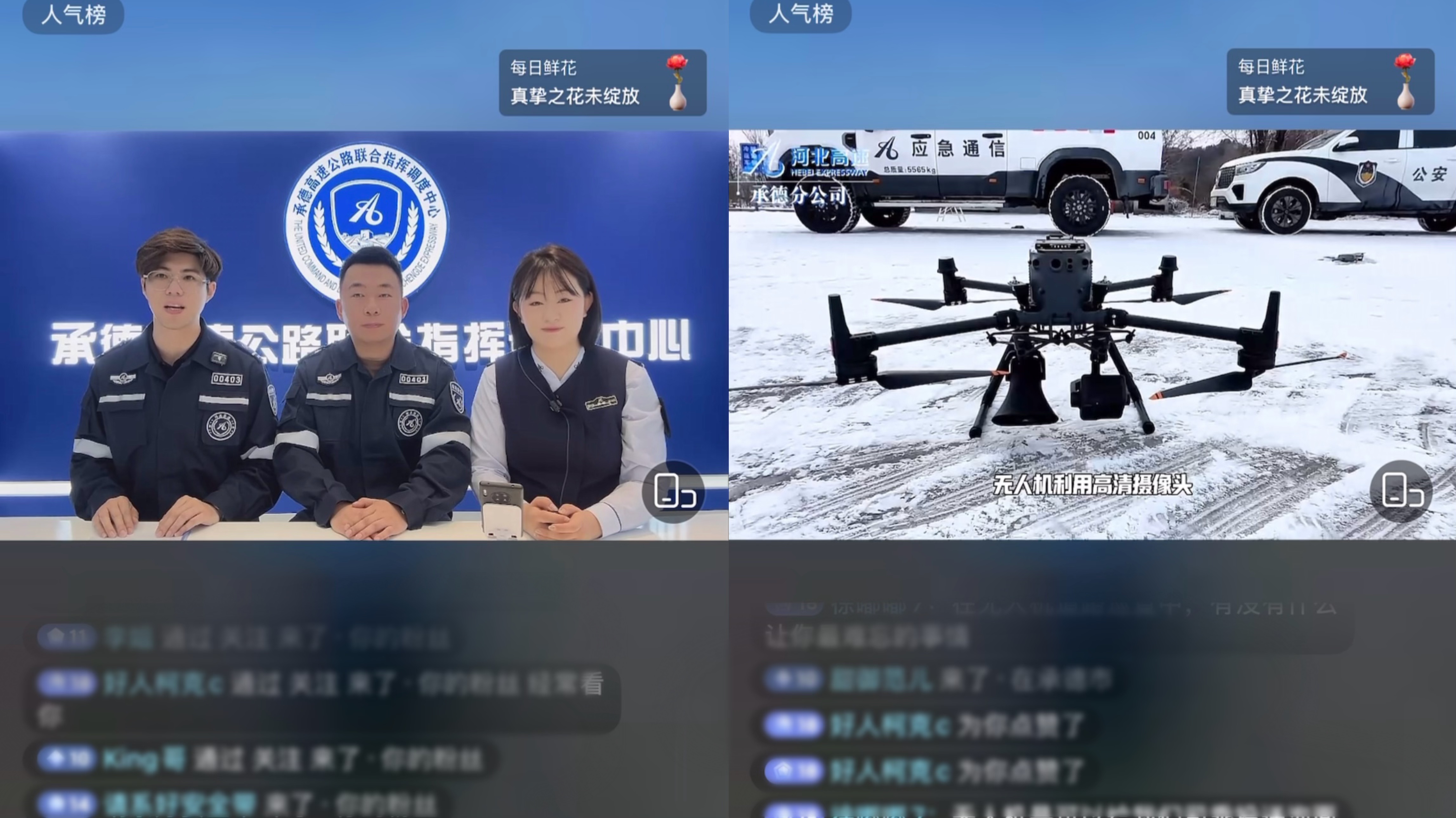 直播中,“技术担当”冯涛、丁立言详解介绍这套被称为高速“移动智慧大脑”的系统是由应急通信指挥车、卫星通讯、无人机应急通信等6大核心系统组成,可在“断网、断电、断路”等极端环境下10分钟内迅速搭建临时通信网络。直播间特别接入无人机实时航拍画面,通过高清镜头、热成像技术和激光测距仪,立体呈现高速公路道路巡查、事故现场处置、恶劣天气保畅、施工监管、物资空投等10大应用场景,并结合实战视频介绍“去年春节降雪时,无人机搭载喊话器循环提示司乘减速,配合交警部门开展压车带道,2小时疏导车流超2000辆。”引发网友刷屏“安全感拉满”。