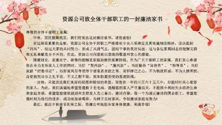 中秋、国庆假期来临之际,为进一步抓紧抓实抓好廉洁文化建设,增强党员干部廉洁齐家的思想觉悟,使廉洁自律意识入脑入心,资源公司开展“向全体干部家书发出廉洁倡议书”活动,推动廉洁教育融入家庭,共筑反腐倡廉家...[详细]
