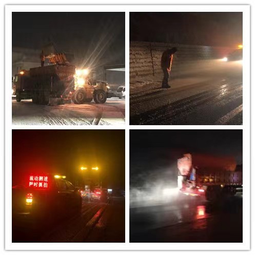 28日凌晨4时24分,辖区内路段出现降雪,路面无积雪、无结冰。为防止路面结冰,涞源养护工区在所辖路段内首次进行撒布融雪剂作业。28日6时至17时辖区内路段天气为雨夹雪或小雪,涞源工区人员持续巡查,路面无积雪、无结冰,车辆正常通行。18时26分,随着部分路段天气转为中雪,涞源工区对辖区内路段进行第二次除雪撒布作业。28日夜间至3月1日凌晨,涞源工区按照提前布置的分组对所辖路段进行巡查。3月1日7时24分,涞源养护工区对所辖路段进行第三次除雪撒布作业。10时04分,所辖路段全线雪停,11时30分完成除雪撒布作业。随后涞源养护工区安排人员巡查,随时关注天气变化,持续观察路面结冰情况并及时处置。据统计,此次共计出动除雪撒布车6辆次,道路巡查车6辆次,撒布融雪剂30吨,人工47日工。