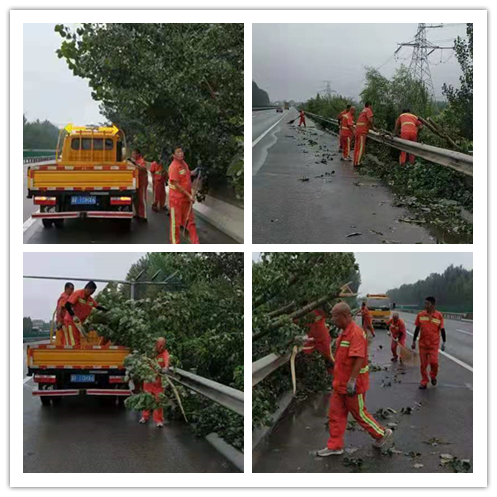 大雨过后,路面由于降雨出现了部分坑槽病害,为防止坑槽进一步发展影响行车安全,徐水养护工区立即组织人员对坑槽进行修补,保障行车安全。由于短时大风导致高速红线外树木倾倒在应急车道上,工区组织职工对倾倒树木进行修剪清理,保障应急车道通畅。大风还导致商庄互通主线桥防抛网连续倾倒,防抛网倾倒以后影响快车道行车安全,工区立即对倾倒防抛网进行拆除,保证快车道行车安全。