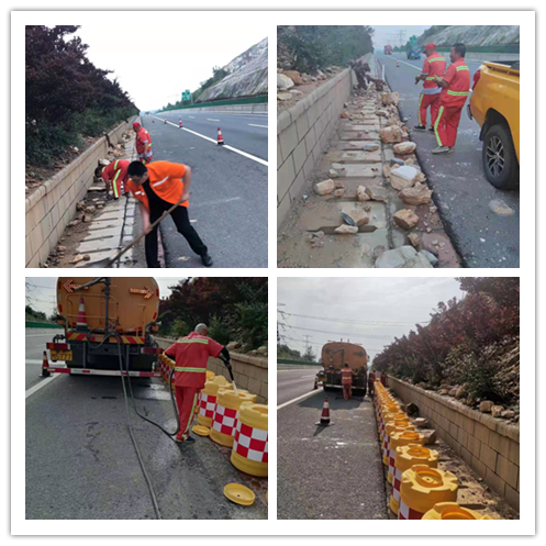徐水养护工区山西方向K910上边坡防护由于降雨导致大量落石洒落在应急车道,工区在雨中巡查时就立即把洒落石头移到应急车道保证行车安全,降雨过后工区组织人员对石头进行清理并在K910应急车道连续摆放防撞桶,防止近期连续降雨高边坡继续落石发生交通事故,消除安全隐患,提示司乘人员安全驾驶。