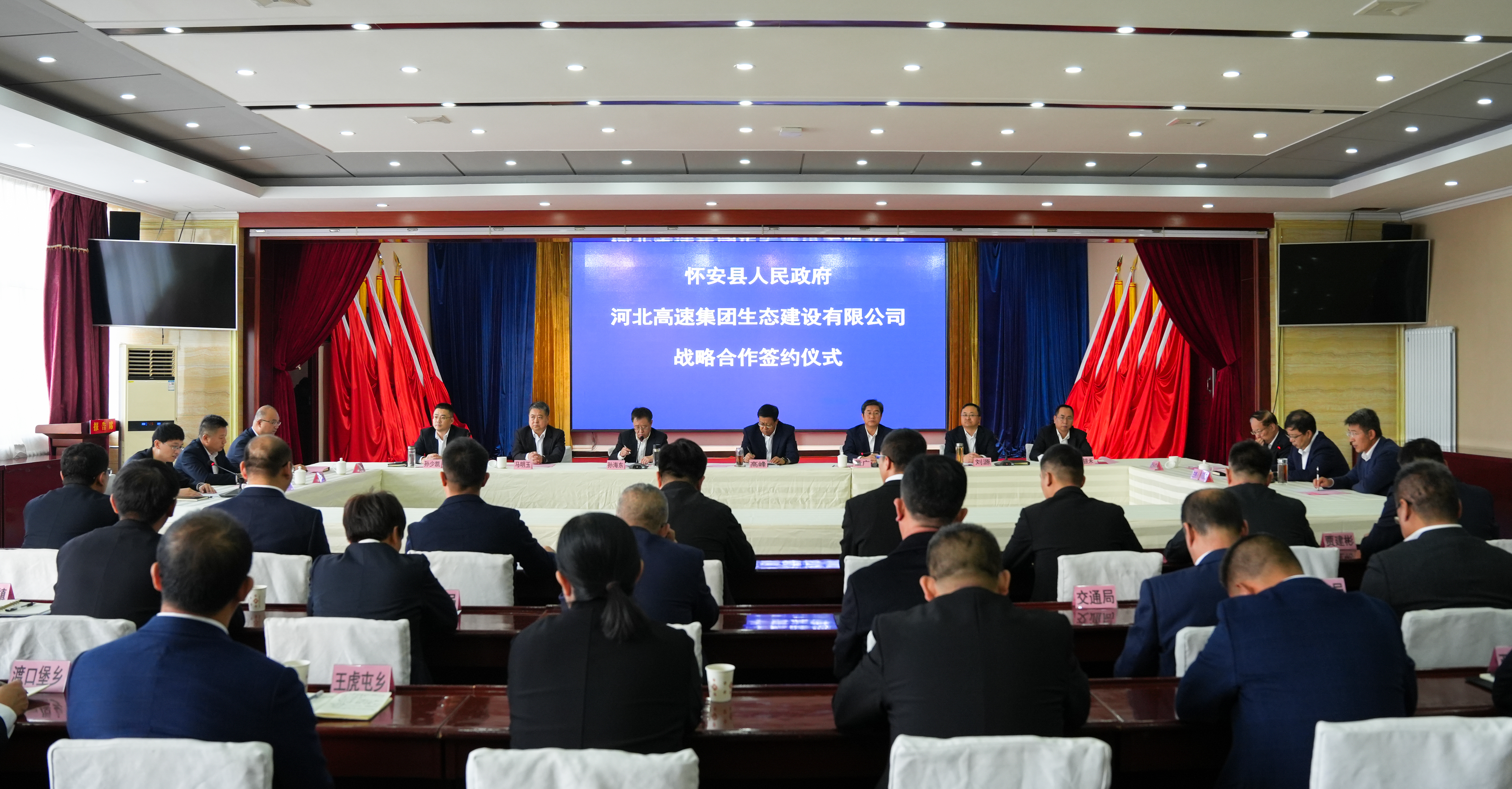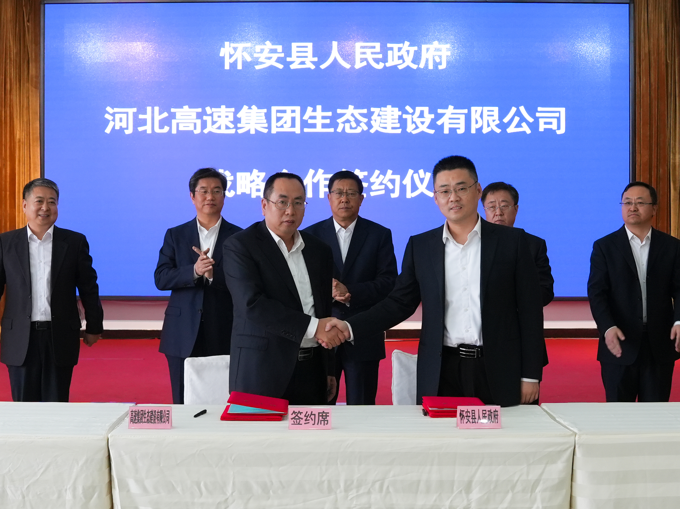 10月25日15时,河北高速集团生态建设有限公司与怀安县人民政府在怀安县宾馆隆重举行了战略合作签约仪式。张家口市政协党组书记、主席高峰,张家口市人大副主任孙海东,河北高速集团党委副书记、董事、工会主席董广,张家口怀安县县委书记刘源,生态建设公司党支部书记、董事马明玉出席签约仪式。怀安县县长孙少凯与生态建设公司总经理焦银禾分别代表双方签署了《战略合作框架协议》及《土地整治(占补平衡)项目合作协议》。怀安县副县长高志宏主持签约仪式。