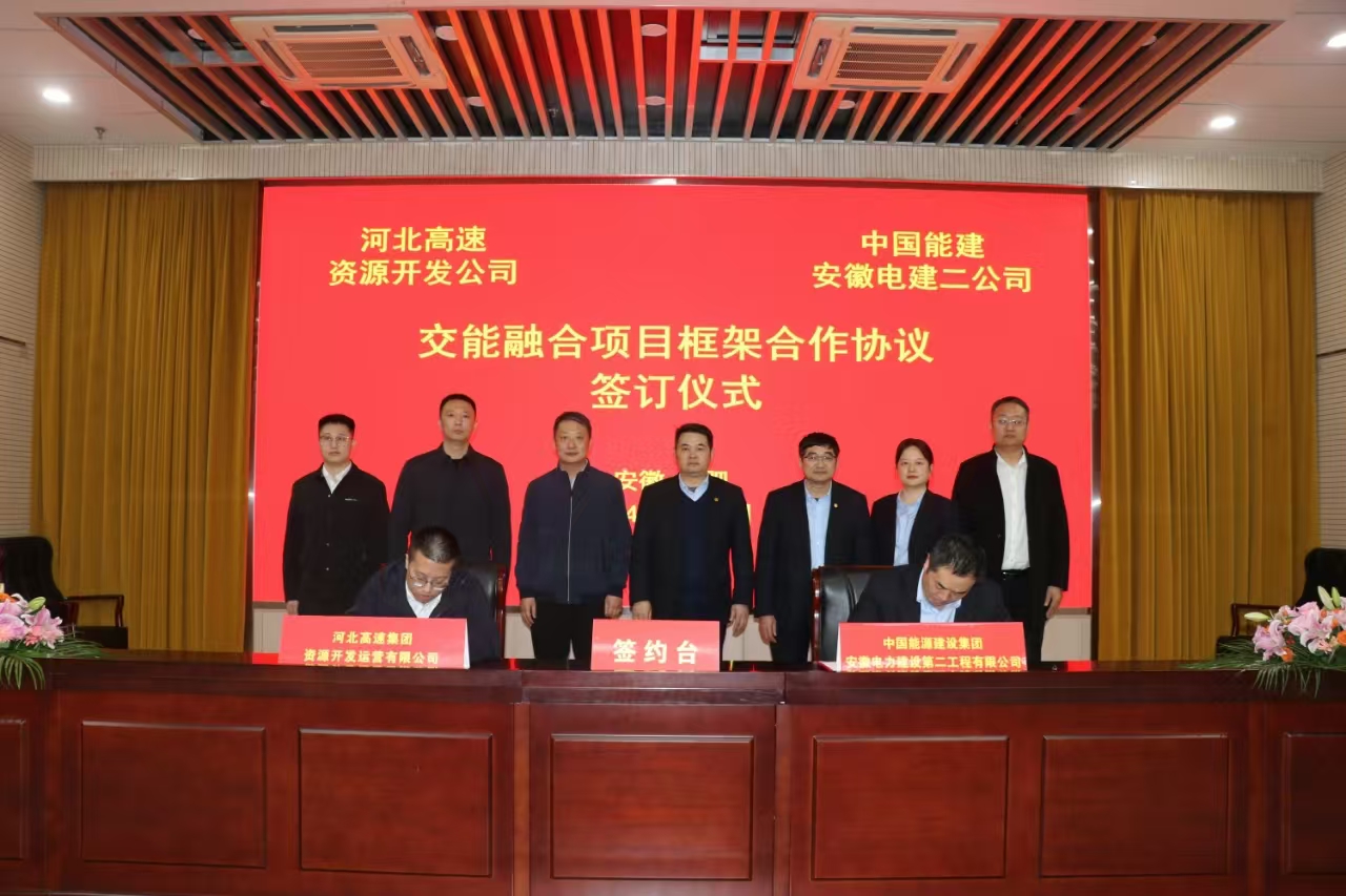 12月2日,河北高速集团资源开发运营有限公司与中国能源建设集团安徽电力建设第二工程有限公司在合肥市签署交能融合框架合作协议。公司党总支书记、执行董事、总经理张云鹏,中国能建安徽电建二公司党委副书记、总经理胡小红出席签约仪式,并就进一步深化交能融合等领域合作交换意见。