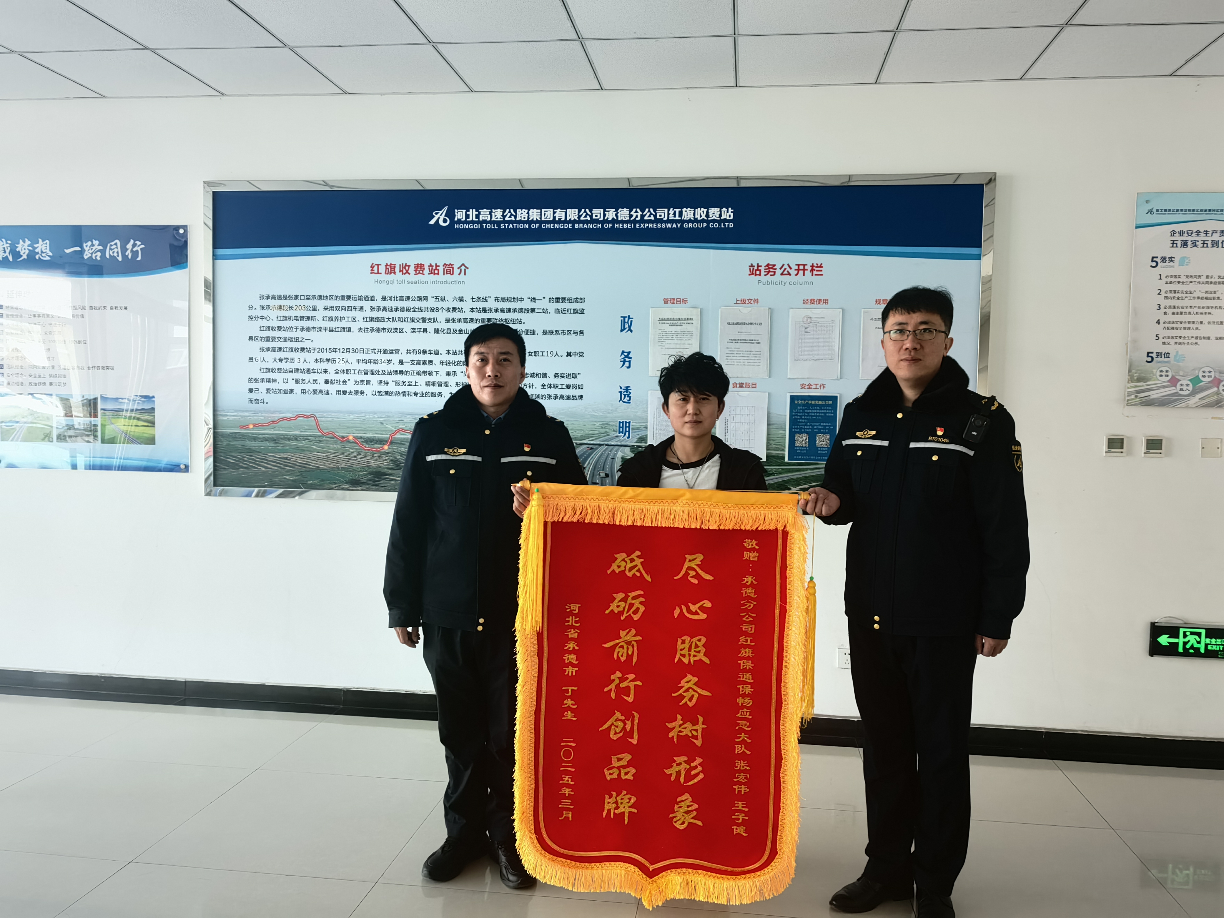 3月5日,承德分公司红旗保通保畅应急大队收到了司乘送来的一面写着“尽心服务树形象,砥砺前行创品牌”的锦旗,每个字都衷心表达了对红旗应急大队队员暖心帮助的感谢和对高速救援服务的肯定。