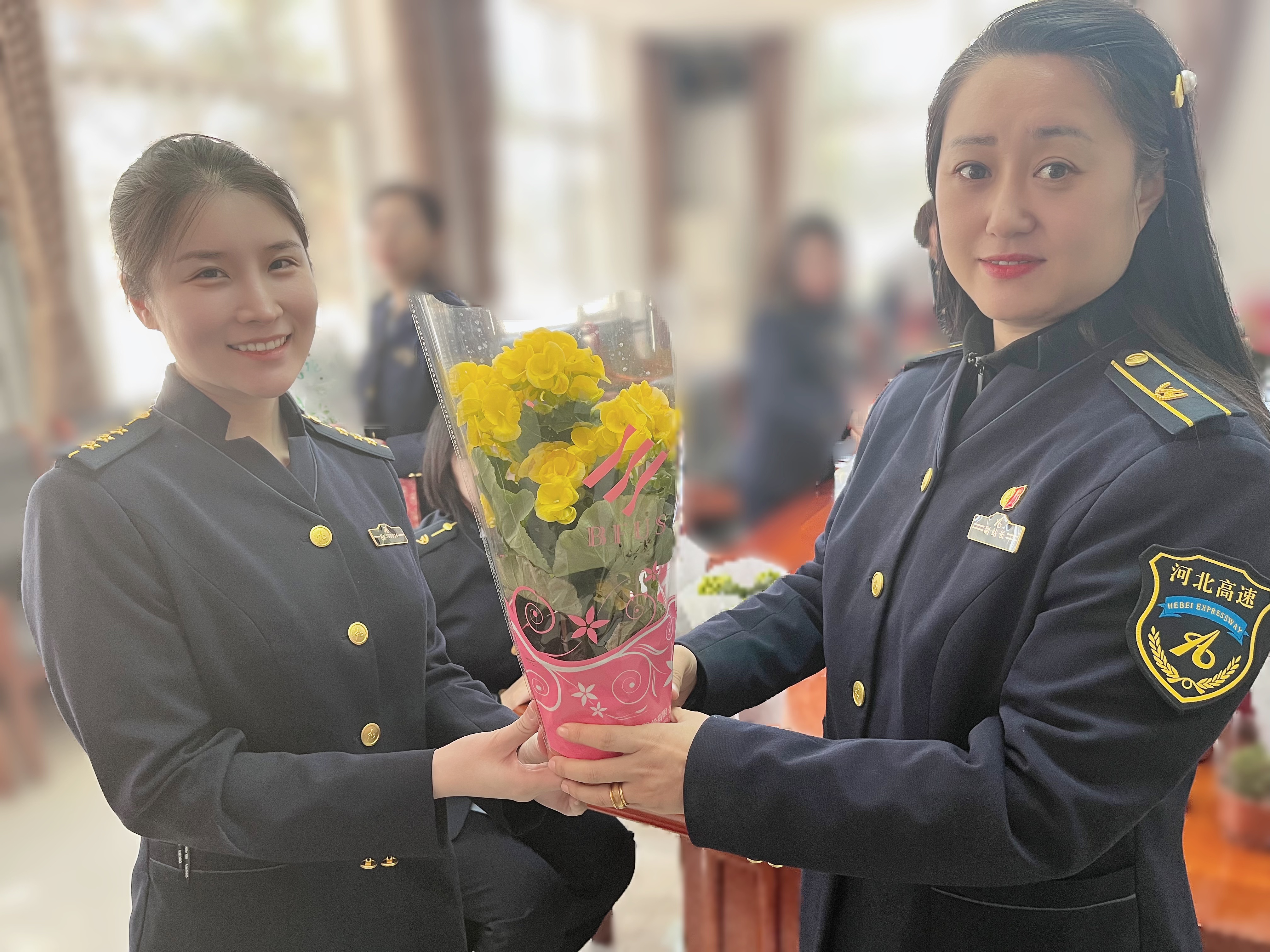 最后,站领导为女职工递上娇艳欲滴的鲜花。手捧鲜花,女职工们的脸上绽放出灿烂笑容,花香与笑容相互交织,构成一幅温馨美好的画面。小小的鲜花,承载着对女职工满满的关爱,也象征着她们如花朵般在岗位上绽放的青春与活力。