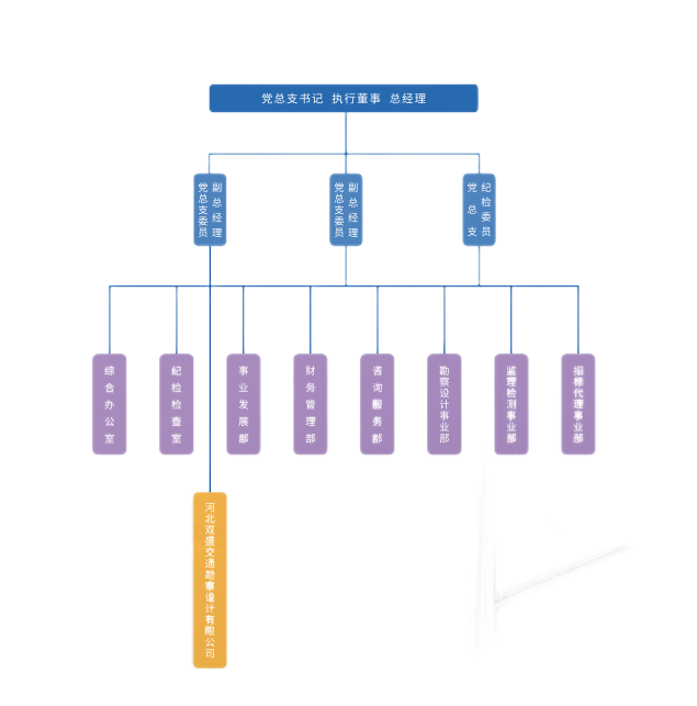 公司内设机构为5个职能部室和3个事业部:综合办公室、纪检检查室、财务管理部、事业发展部、咨询服务部;勘察设计事业部、监理检测事业部、招标代理事业部。