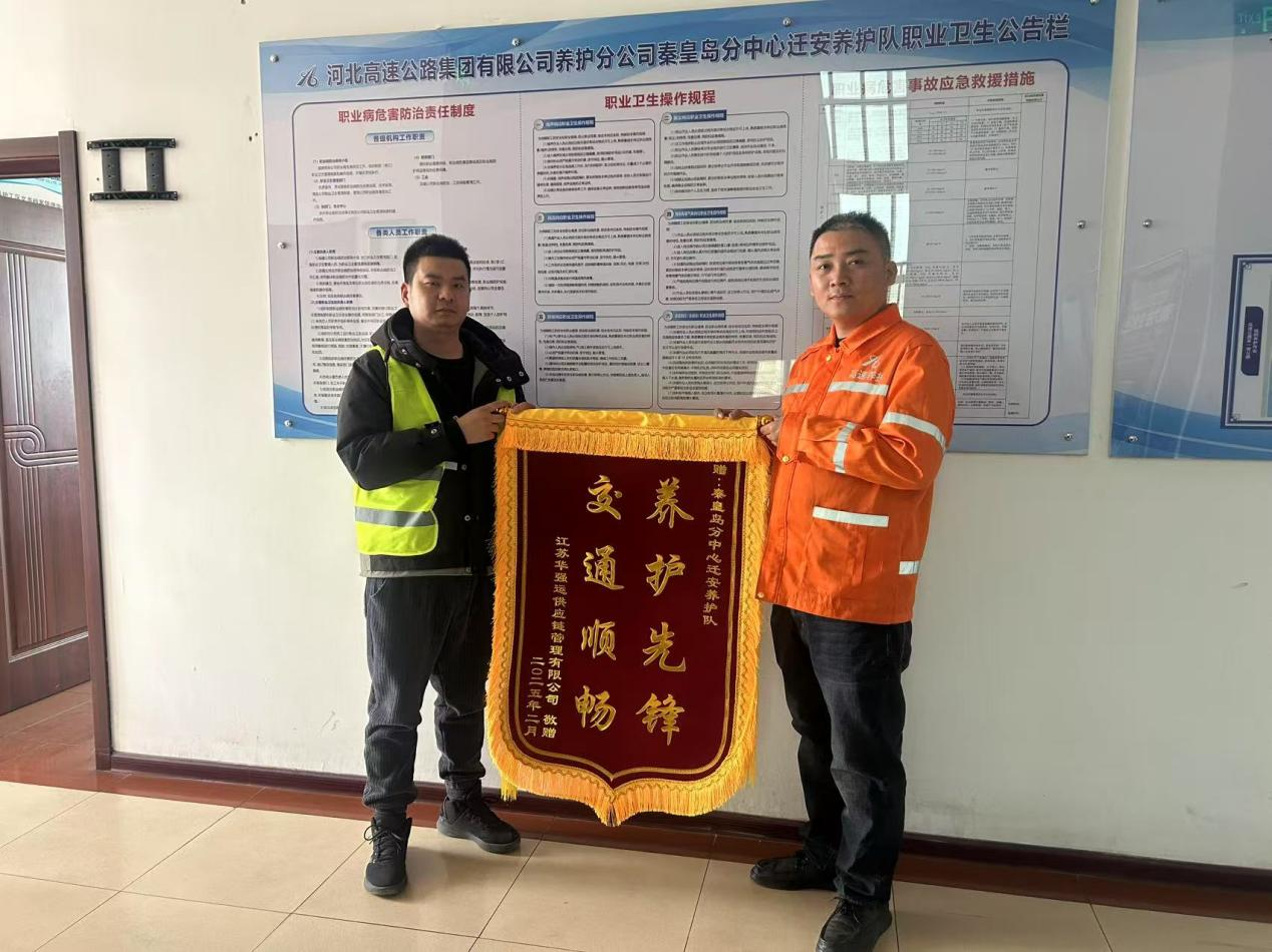 3月4日上午,江苏华强运供应链管理有限公司送来一面“养护先锋,交通顺畅”锦旗,表扬在风力发电设备组件运输中给予的大力支持,保障了大件运输的安全,对迁安养护队在运输任务中给予的帮助和关键支持表示由衷的感谢。