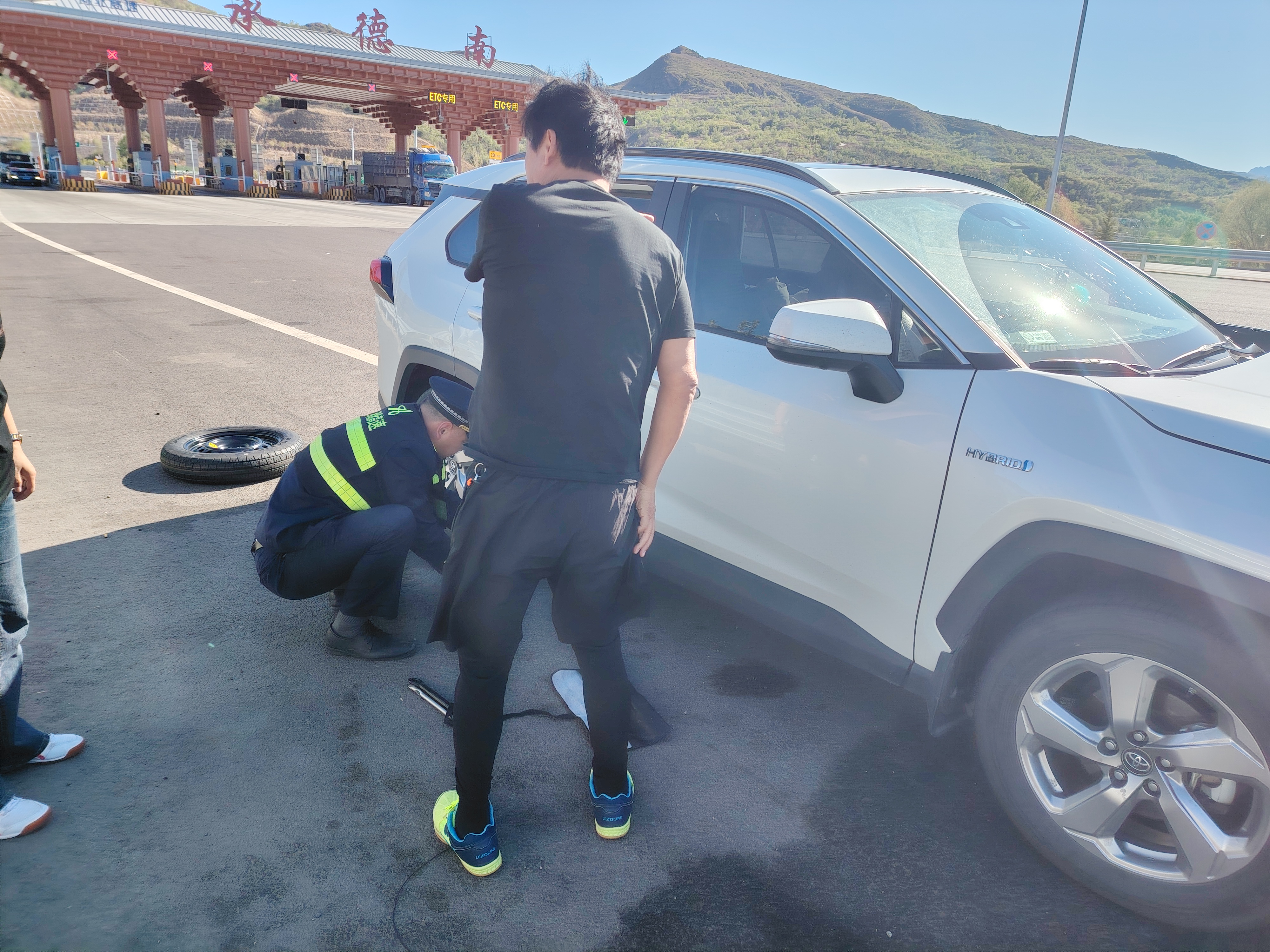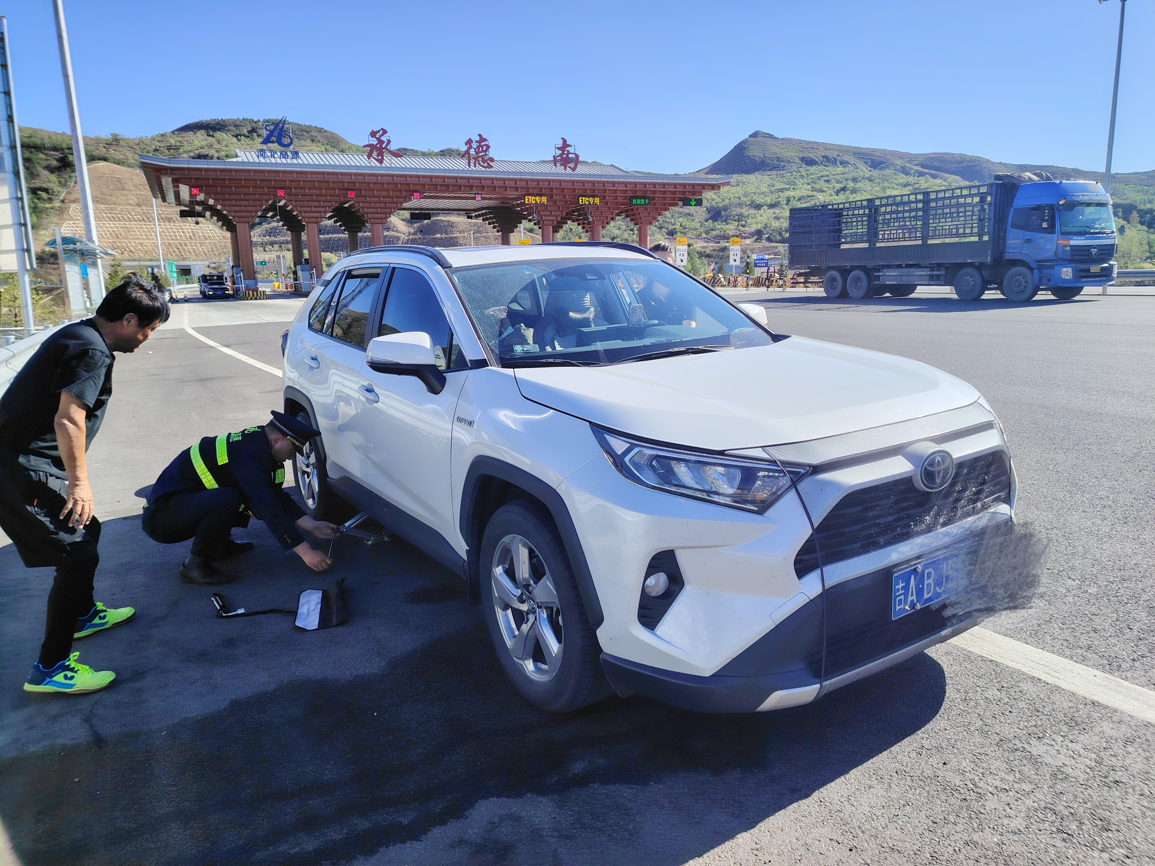 4月27日,承德南收费站出口上演暖心一幕,收费班长金茂盛热心帮助故障车辆更换轮胎,赢得司乘点赞。