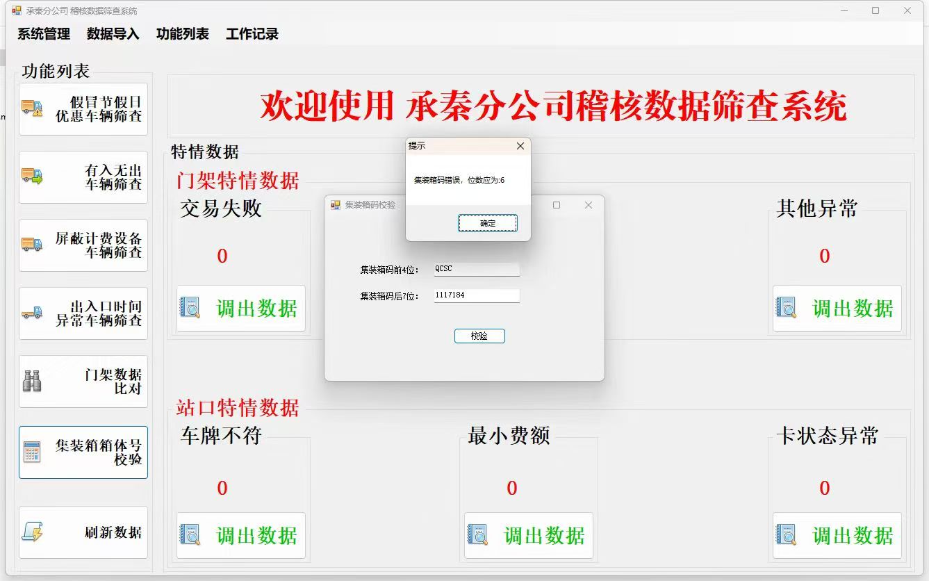 承秦分公司稽核管理中心联合机电管理中心在创新路上继续前行,推出了集装箱箱体号校验模块。之前辨别集装箱真伪需要人工计算集装箱箱体号,计算过程非常复杂,且数据量大、易出错,现在使用集装箱箱体号校验模块,输入箱体号后即可1秒钟辨别箱体号真伪,快速确定车辆是否享受集装箱优惠政策。使用该系统模块以来,稽核管理中心共侦办两起假冒集装箱车辆逃费大案要案,共追缴逃费金额数万元,不仅高效打击了假冒集装箱车辆的逃费行为,从而确保降本增效工作取得实效。