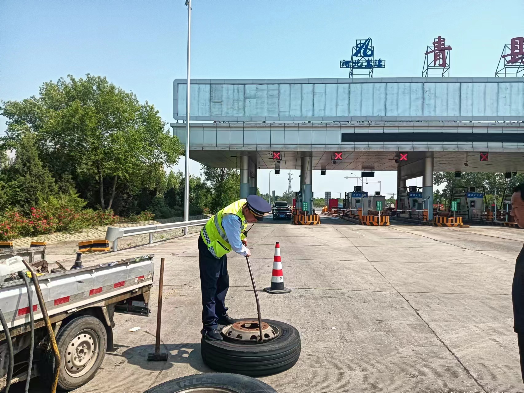 5月20日下午13时,一辆冀B牌照的货车“一瘸一拐”朝青县收费站驶来,车辆呈倾斜状态,随时有翻车的风险。当值白班的收费员孙玉荣看到这一情况,立刻用对讲机上报班长张小亮。