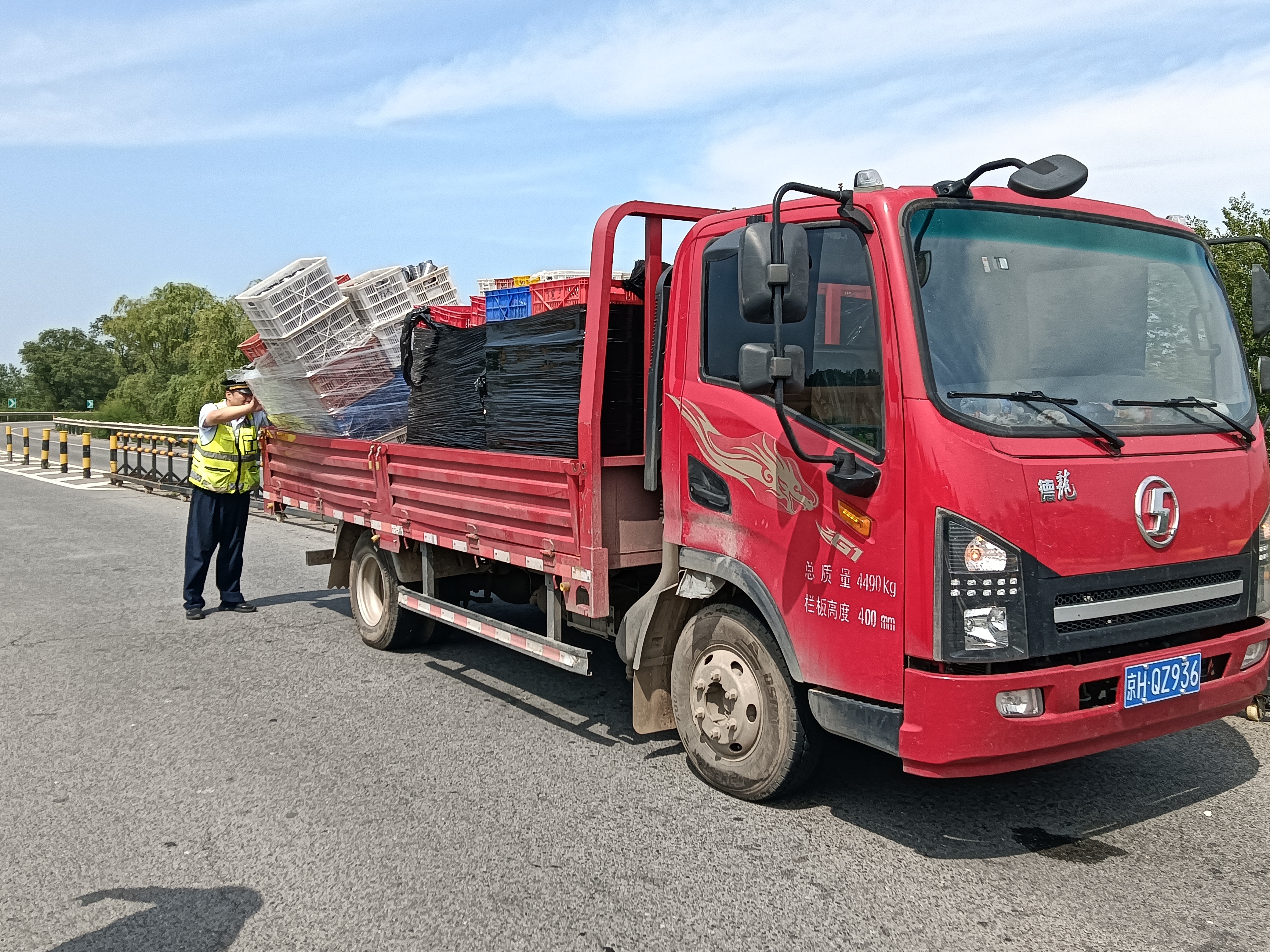 近日,一辆红色货车在南皮收费站下道,进入收费广场后,货物突然散乱一地,收费员韩丽娜发现后立即呼叫班长:“班长!收费广场上有辆小货车货物撒落,需要支援!”