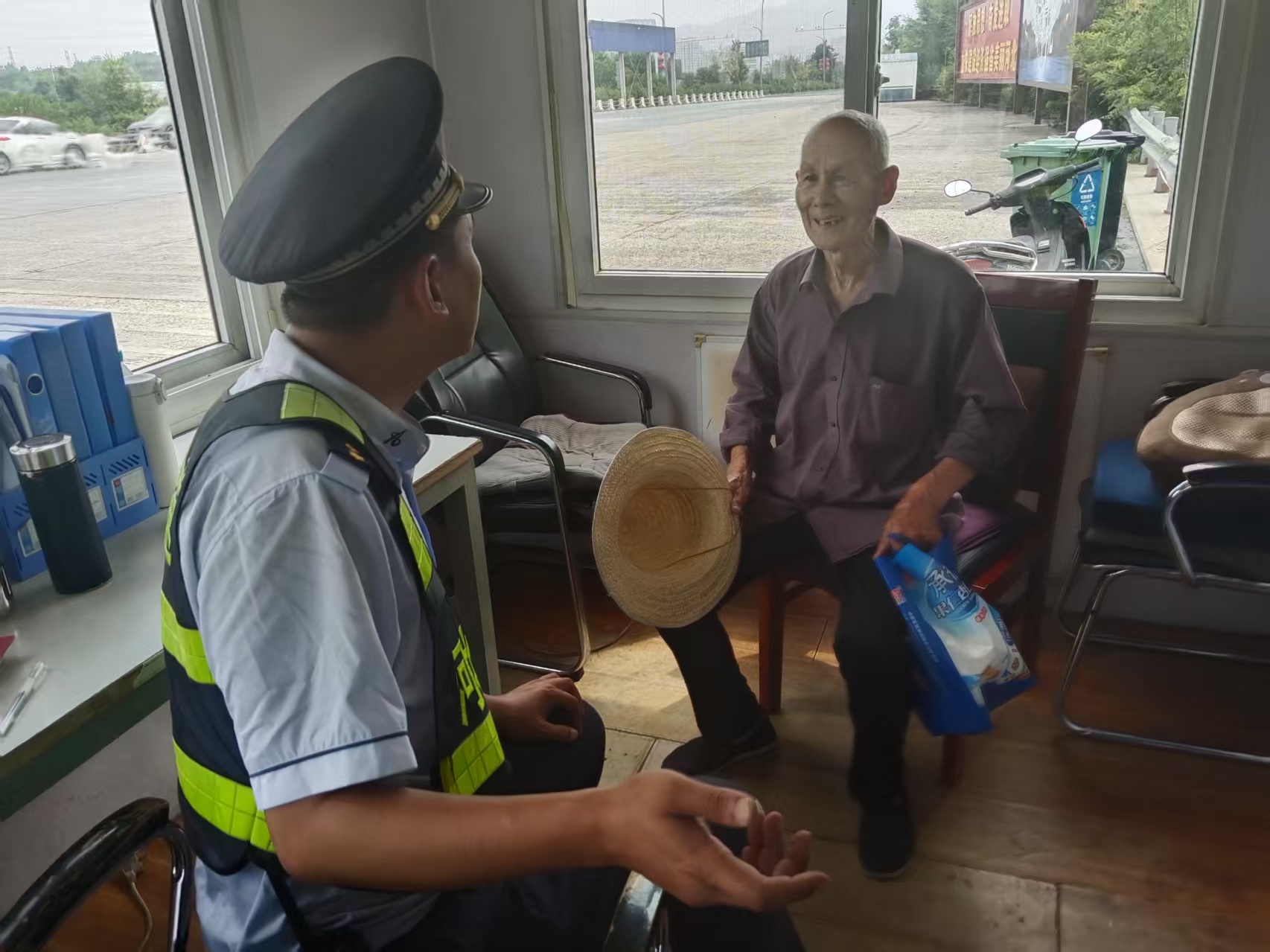 午后阳光炽热,滦河收费站工作人员在忙碌中,敏锐察觉一位头戴草帽、手提印有商品图案袋子的老人在站外空地焦急徘徊,神色迷茫。工作人员立即暂停工作,快步上前关切询问。