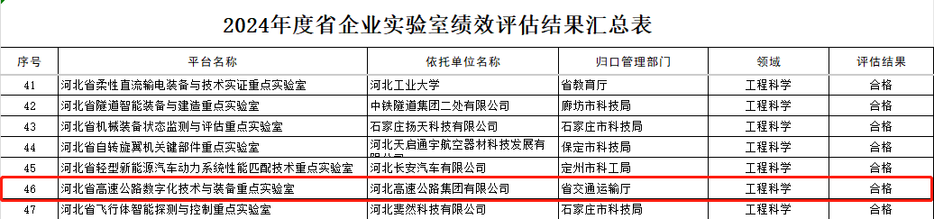 近日,河北省科学技术厅公布了2024年度省重点实验室、技术创新中心绩效评估结果,河北省高速公路数字化技术与装备重点实验室顺利通过省科技厅专家组评估,标志着实验室在科技创新和服务行业发展方面取得了阶段性成果。
