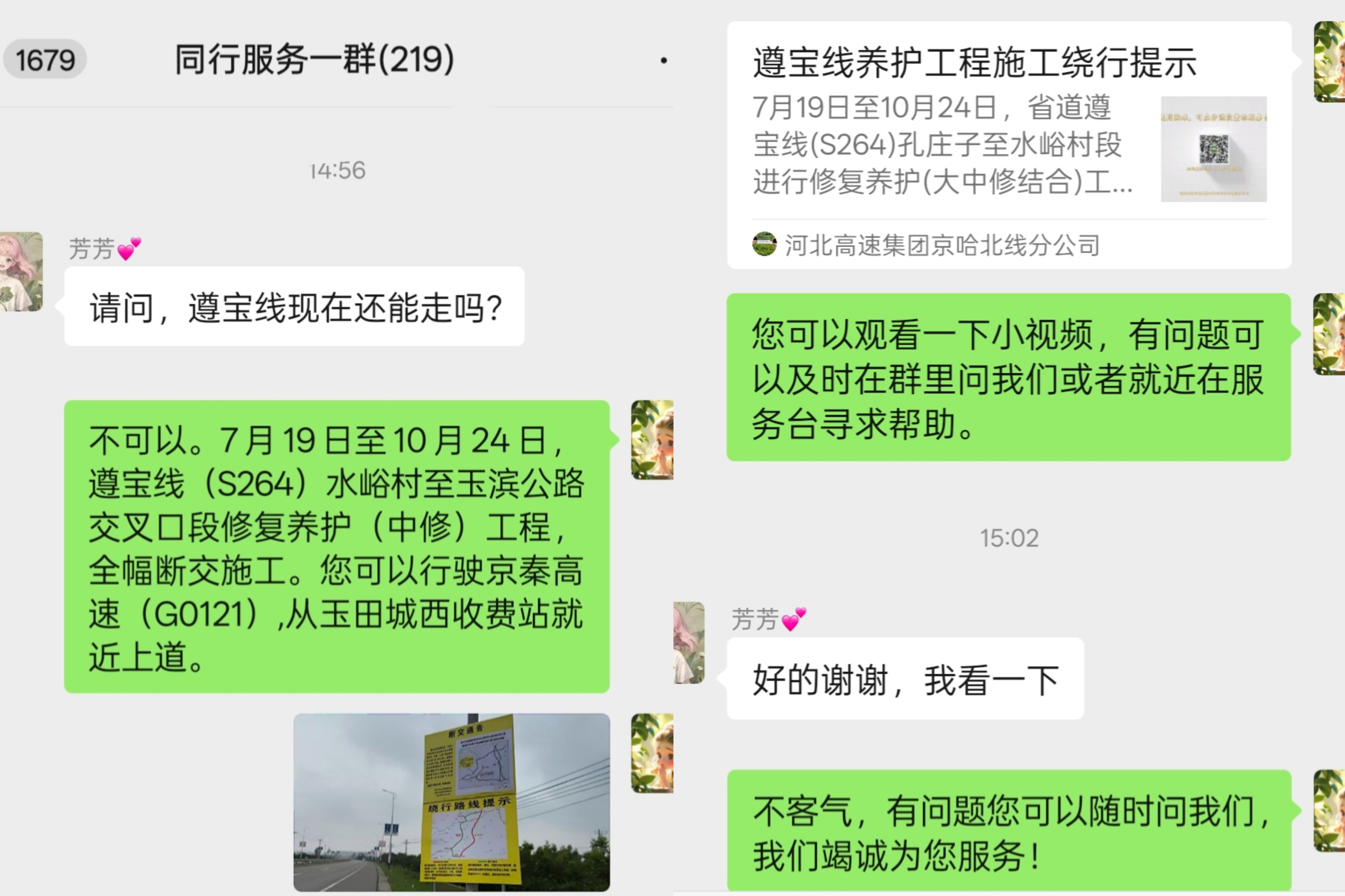 玉田城西收费站利用“同行服务群”搭建信息沟通渠道。针对群内司机询问的“遵宝线是否可以通行”“绕行京秦高速(G0121)怎么走方便”等问题,工作人员做到“有问必答、快速响应”。同时,工作人员在群里了转发分公司制作遵宝线养护工程施工绕行提示小视频,直观展示了从断交处绕行至京秦高速(G0121)的最佳路线,步骤清晰、易懂好记。小视频在群内发布后,迅速引发关注,众多司机纷纷称赞视频实用贴心,为他们的出行提供了极大便利。