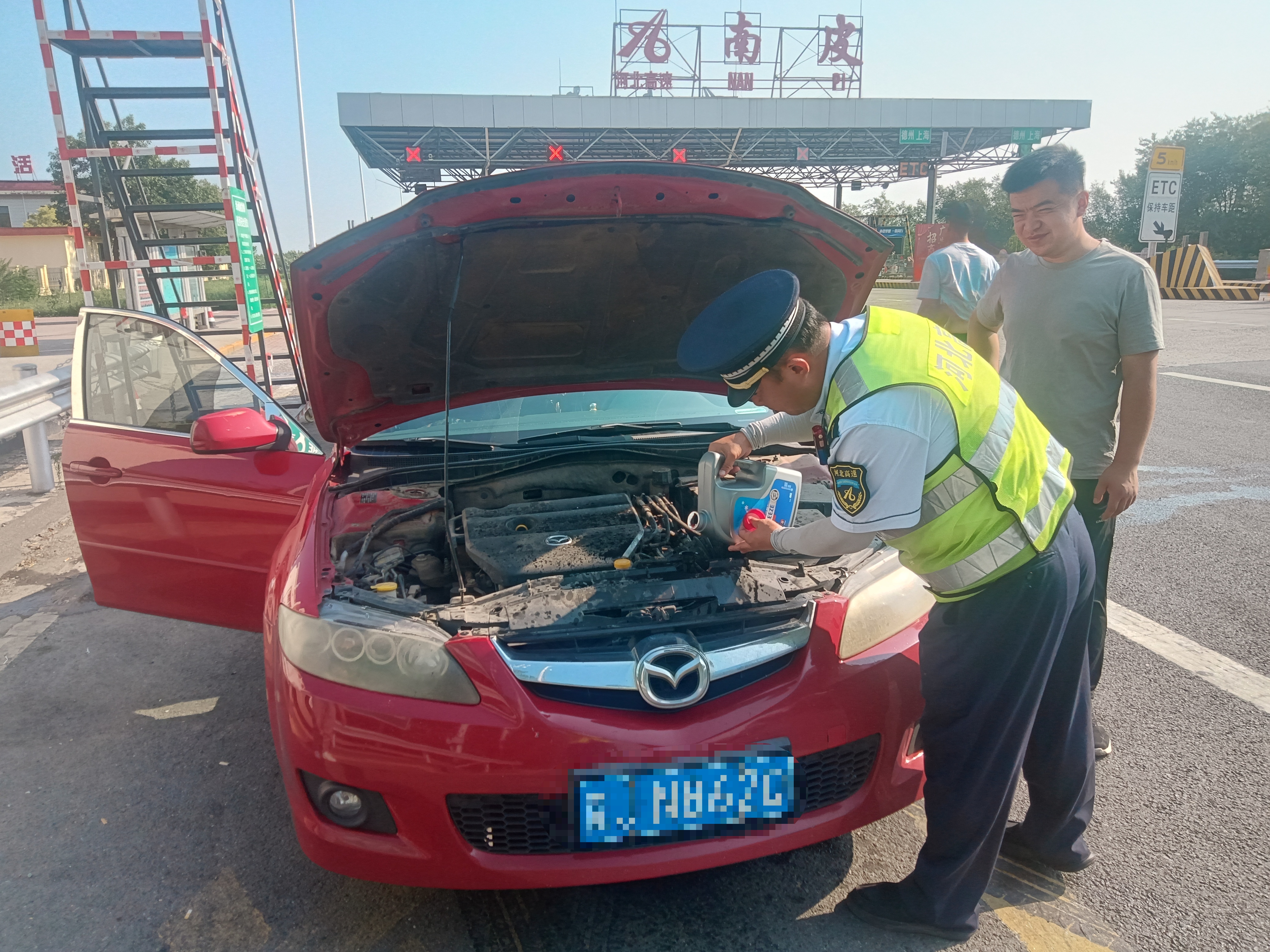 7 月 27 日,高温持续来袭。上午 8 点20 分左右,京沪分公司南皮收费站收费广场上停下一辆前机盖冒着白烟的小轿车。当班班长刘义强见状,立即上前查看情况。
