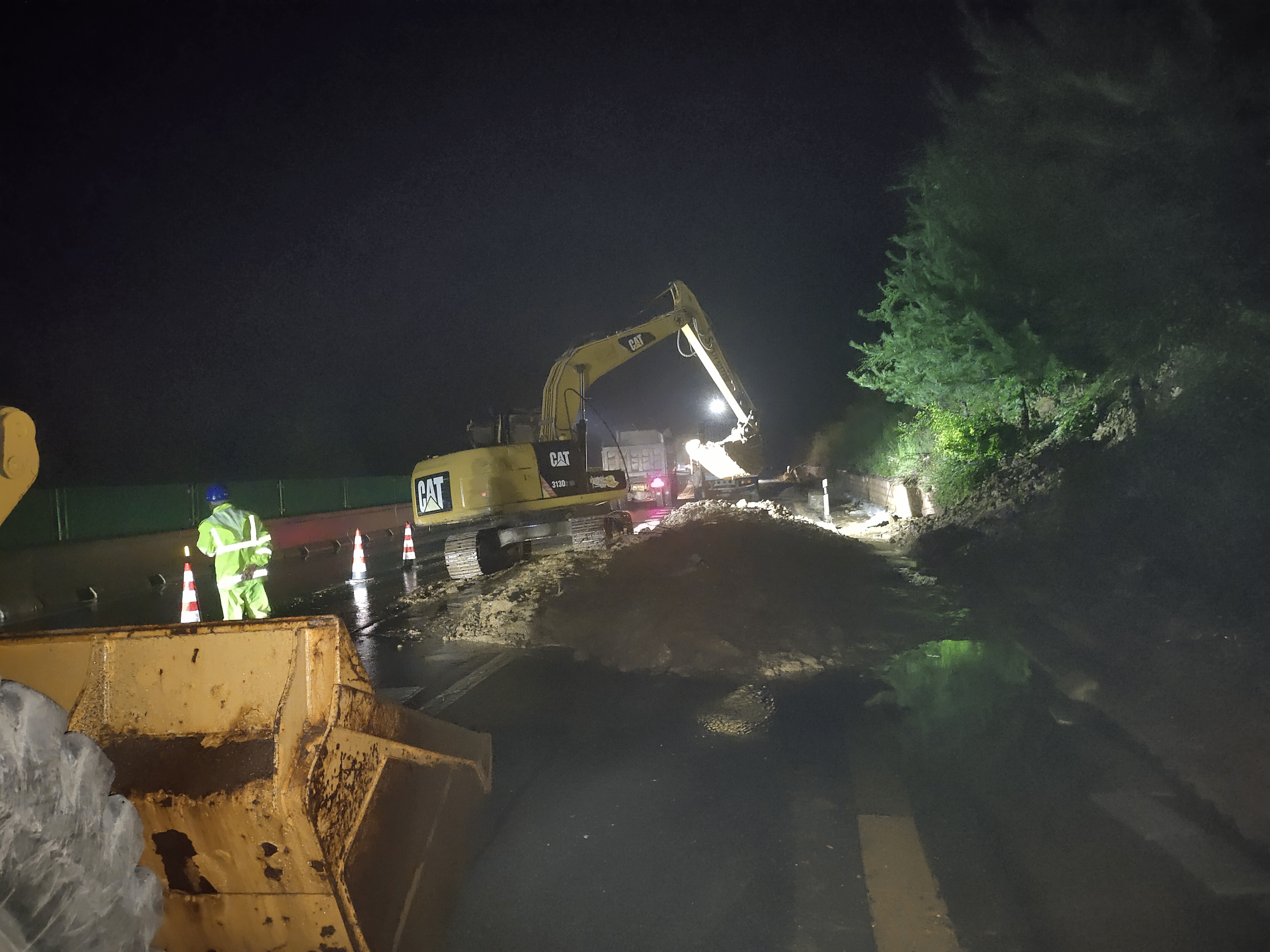 雨中奋战,全员在岗绷紧“安全弦”。降雨期间,中心全体干部职工取消休假,24小时在岗备勤,随时待命,时刻保持临战状态。各养护队加大道路巡查力度,加密巡查频次,确保及时发现并处置险情。其中,围场养护队在巡查过程中,第一时间发现K38+100路基水毁险情。险情就是命令,养护队迅速行动,立即采取有效防护措施,成功化解社会车辆冲出高速的风险。