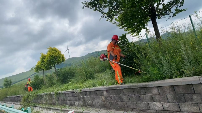 安全帽下,汗水早已浸透衣衫,顺着帽带不断淌下,毒辣的日头炙烤着大地,也考验着他们的意志。然而,没有迟疑,没有退缩,除草机轰鸣、铁锹翻飞、水花喷洒……队员们的身影坚定地活跃在高速公路的边坡、中分带。修剪疯长的杂草、精心培护树坑、及时浇灌苗木、清理隐患杂树——每一项看似平凡的工作,都是对“畅安舒美”行车环境最坚实的承诺。