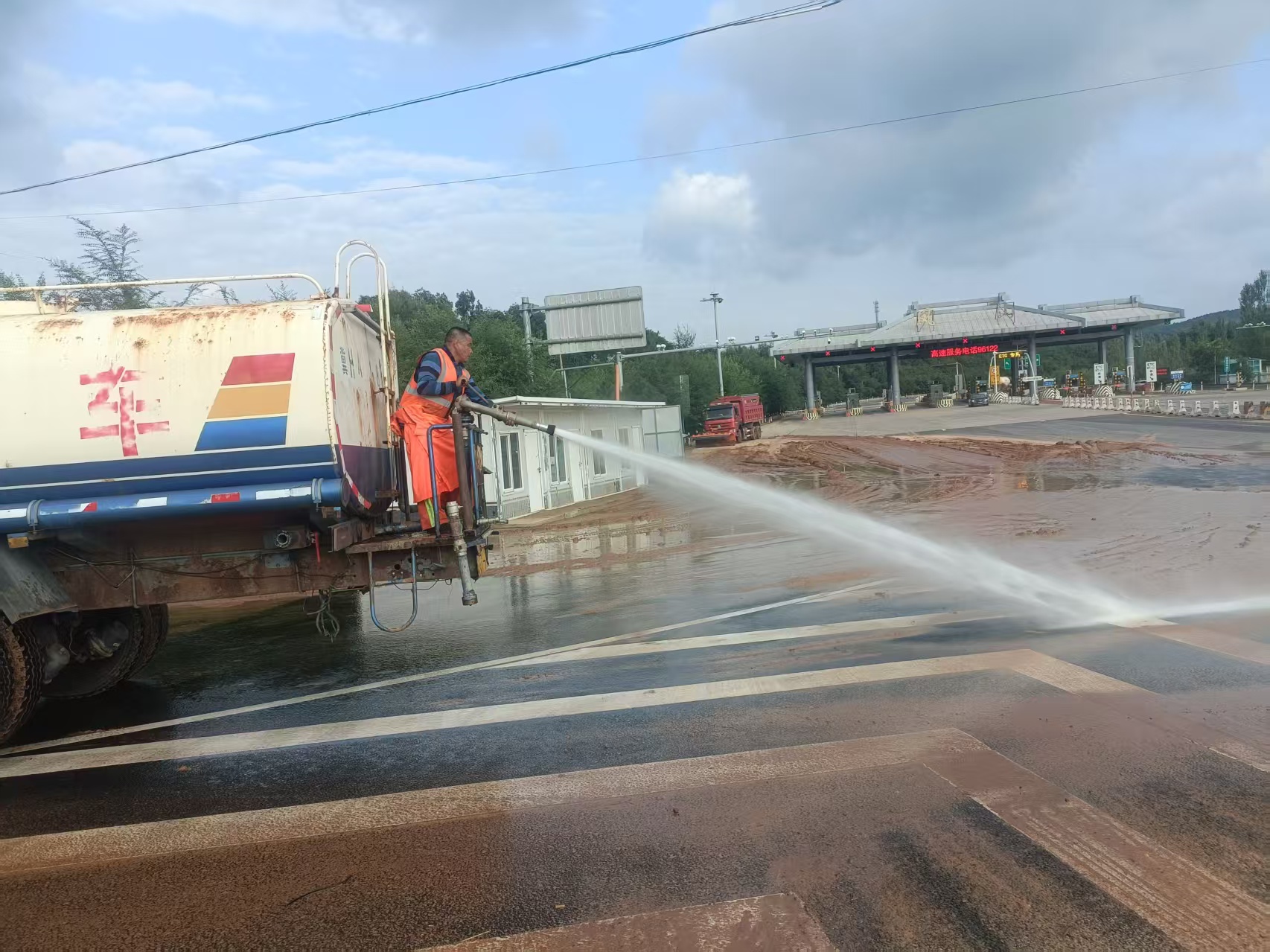 近日,受降雨影响,导致辖区内凤山收费站下道出现泥沙冲入路面,严重影响道路行车安全。8月21日,红旗养护队闻“汛”而动,第一时间启动应急处置预案,组织人员设备赶赴现场开展清理作业,通过采取分段式作业,不放过任何一处影响通行的“障碍”,养护人员先用除雪车对大面积的淤泥进行清铲,随后调动洒水车对残留泥沙的路面进行冲洗,最后手持扫帚、铁锹,对路面淤泥、杂物进行细致清理。经过数小时的紧张奋战,该下道路面泥土清理干净,道路恢复正常通行。