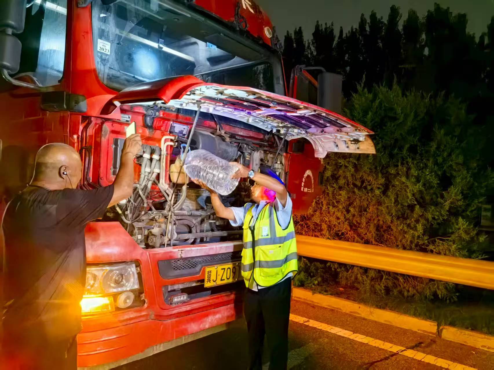 8月19日深夜,一辆车牌号为冀JZ*的货车因发动机温度过高无法正常行驶,面对这一突发状况,司机焦急万分。当班工作人员发现后立即拿来水桶向发动机舱注入冷却水并细致检查车辆状况,全面排查安全隐患。