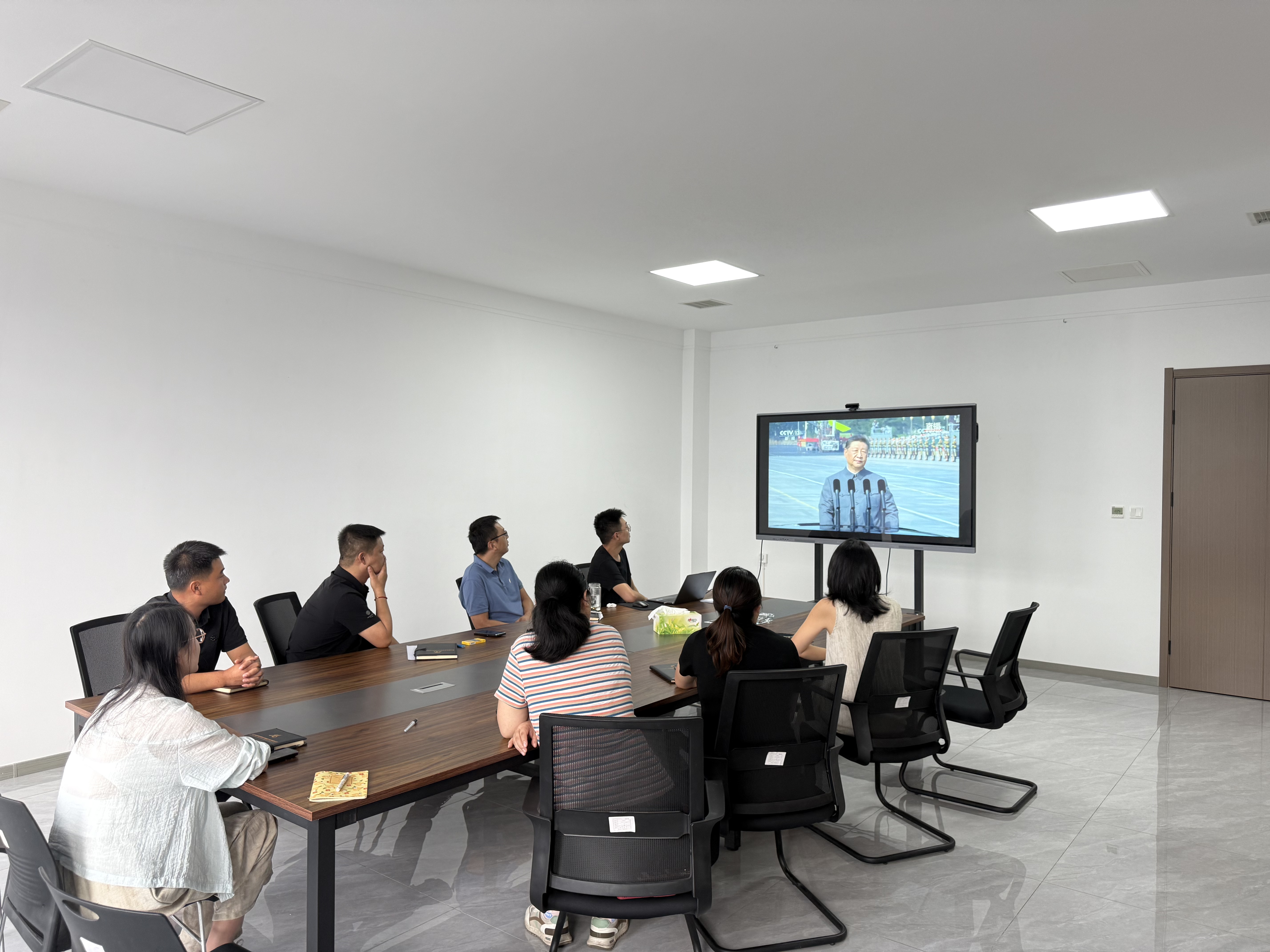 会议室内气氛庄重热烈,习近平总书记的重要讲话震撼人心,天安门广场上铿锵的步伐和嘹亮的口号激发一腔热血,大家神情专注,时而爆发出雷鸣般的掌声,时而跟随现场的氛围摇旗欢呼,心中激荡着对抗战英雄的无限敬仰与缅怀和对实现中华民族伟大复兴的坚定信心和决心。