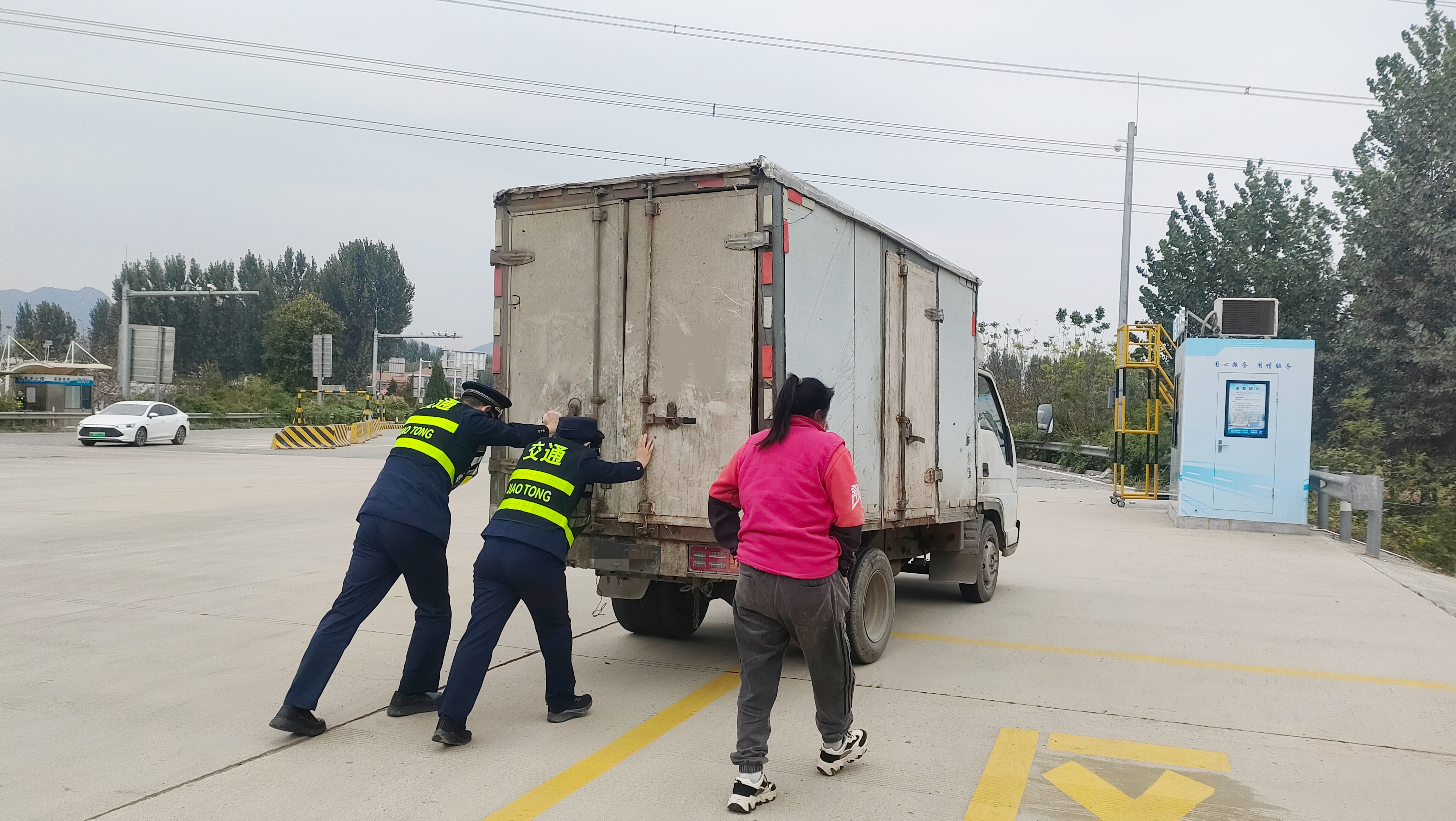 司机多次尝试点火,发动机始终毫无反应。车辆停在车道中央,不仅影响后方车流通行,更存在安全隐患。这一紧急情况,被当班班长迅速察觉。他第一时间召集疏导人员赶到现场,详细询问车辆故障情况。在确认车辆短时间内无法启动后,为保障车道畅通与司乘安全,班长当即带领工作人员合力徒手推移货车,从车道推至收费广场的安全区域。随后,班长又从站内便民服务箱中找出附近汽车维修点的联系名片,主动帮司机联系维修师傅,细致说明车辆故障现象与具体位置,为后续维修节省时间。