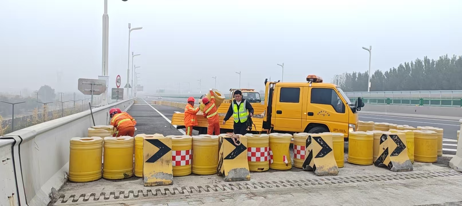 10月27日,接到省交通运输厅“力争10月底前开放运营”的指令后,养护分公司雄安分中心固安养护队迅速响应,立即进入全天候作战状态。队员们清晨七点前出发,三餐由司机直接送至工地,争分夺秒推进各项任务:一是整理、移位并撤除反光桶及水泥隔离墩约200个,新增10个。因单个隔离墩重达一二百斤,全程利用叉车、铲车等配合搬运,确保设施布设精准到位。二是出动洒水车,对容易线上下匝道双向共4条车道进行彻底冲洗,清除积尘与污渍,提升路面洁净度与行车安全。三是路域环境彻底清理,组织人工细致清理路面杂物、边坡杂草及各类零散垃圾,确保路容路貌整洁。