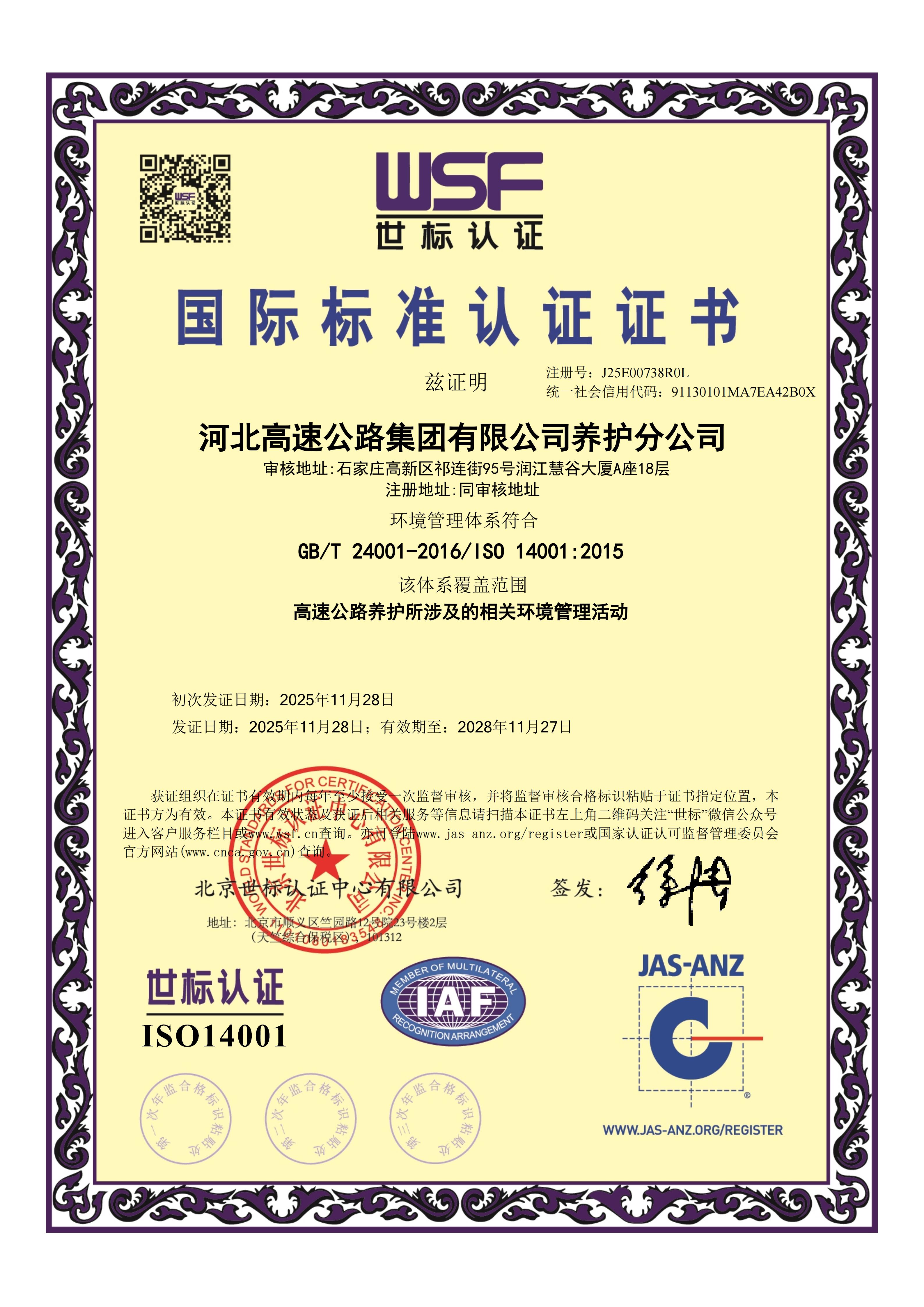 2025年11月28日,九游官方网站养护分公司成功通过质量、环境、职业健康安全管理体系认证审核,正式取得认证证书,标志着养护分公司在标准化、规范化管理领域迈出关键一步,为高质量发展奠定了管理基础。