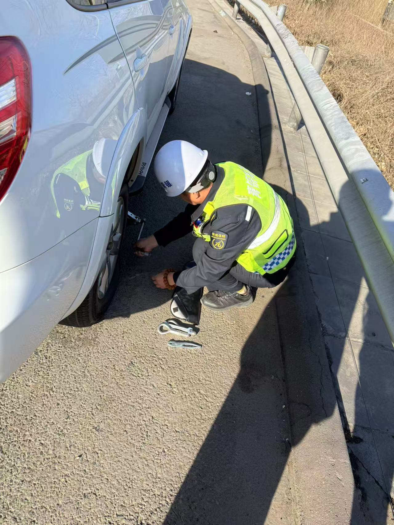 两人立即停车上前询问情况,得知车主因车辆突发爆胎,却不会更换备胎而手足无措。了解情况后,队员许方川第一时间搬出反光桶,在车辆后方规范设置安全警示区域,筑牢道路安全防线;队员暴胜文则迅速取出修车工具,熟练地为车主更换备胎。