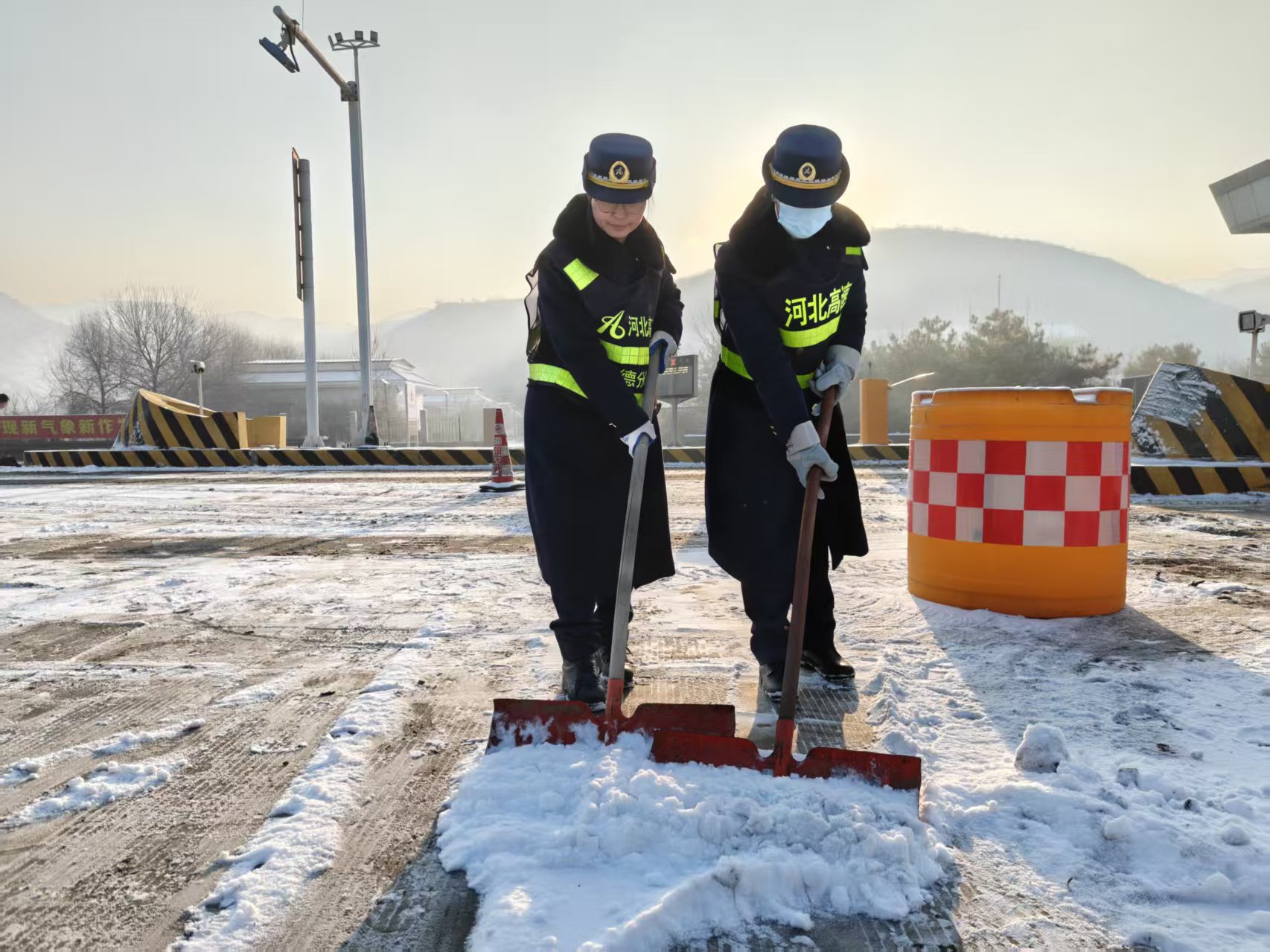 一组人员重点清理收费广场及车道,另一组则负责收费岛头、岗亭周边等关键区域。大家细致清扫、不留死角,全力恢复路面整洁,保障通行条件。除雪同时,职工们不忘主动服务司乘:有的引导车辆有序通行,有的提醒驾驶员减速慢行,还有的为滞留人员送上热水,在寒冬中传递温暖。