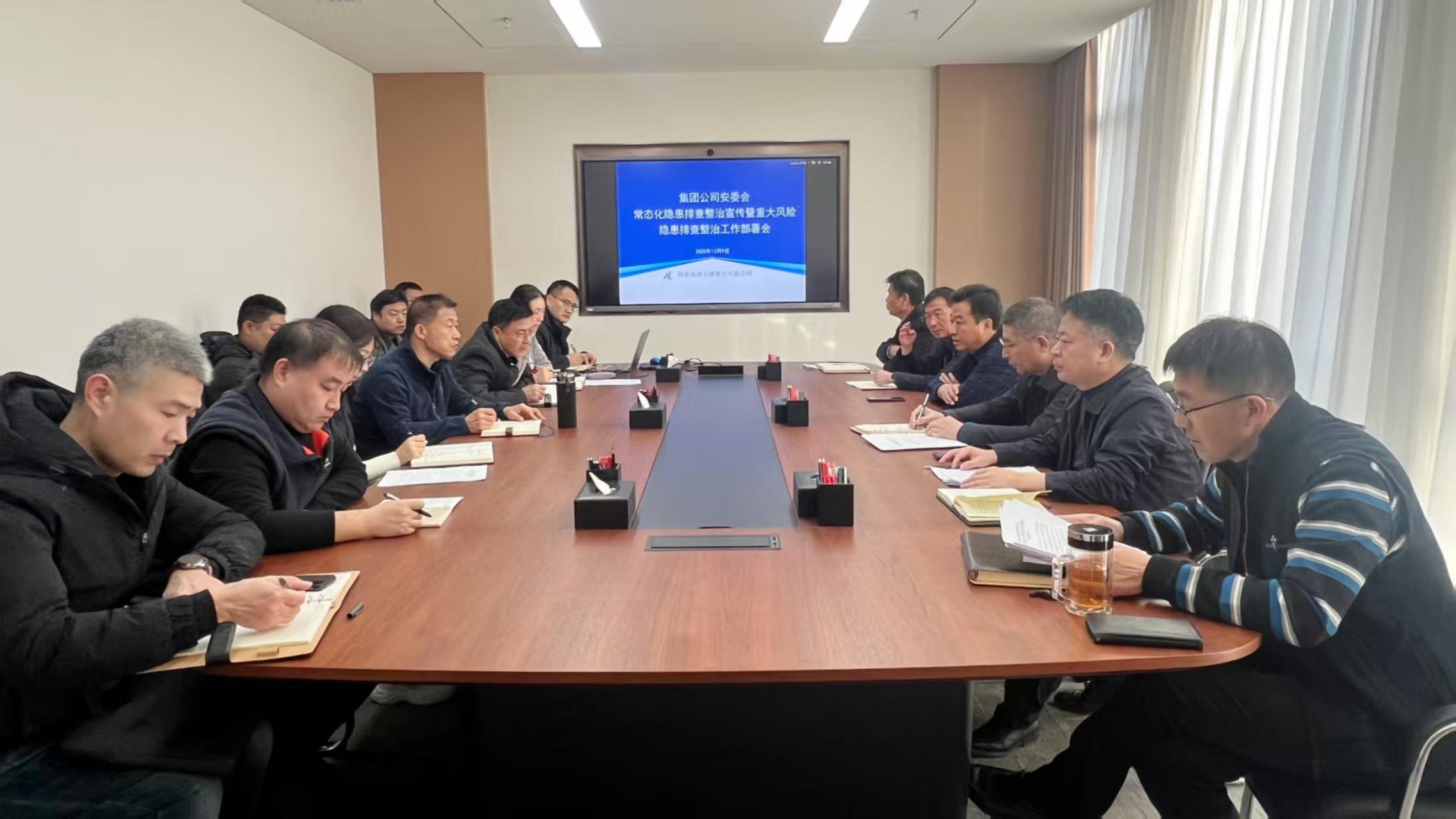 为深入贯彻习近平总书记关于安全生产的重要指示批示精神,认真落实交通运输部、省交通运输厅关于安全生产工作部署,以及集团公司党委关于年终岁尾安全生产隐患排查整治工作要求,2025年12月9日,集团公司安委会组织召开常态化隐患排查整治宣传暨重大风险隐患排查整治工作部署会。集团公司副总经理于建游、安全总监卢立新出席会议并讲话,安全环保部部长甄伟超主持会议,建设管理部部长杨立伟及有关人员参加会议。