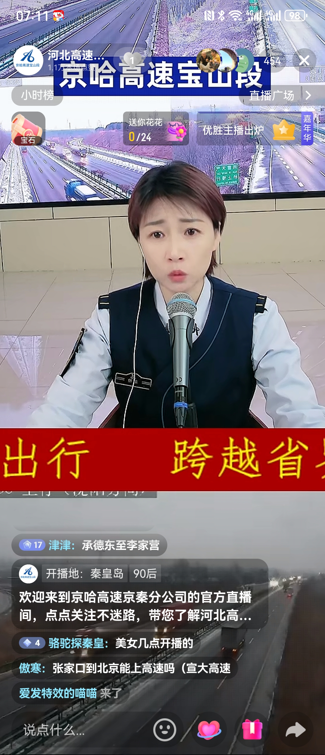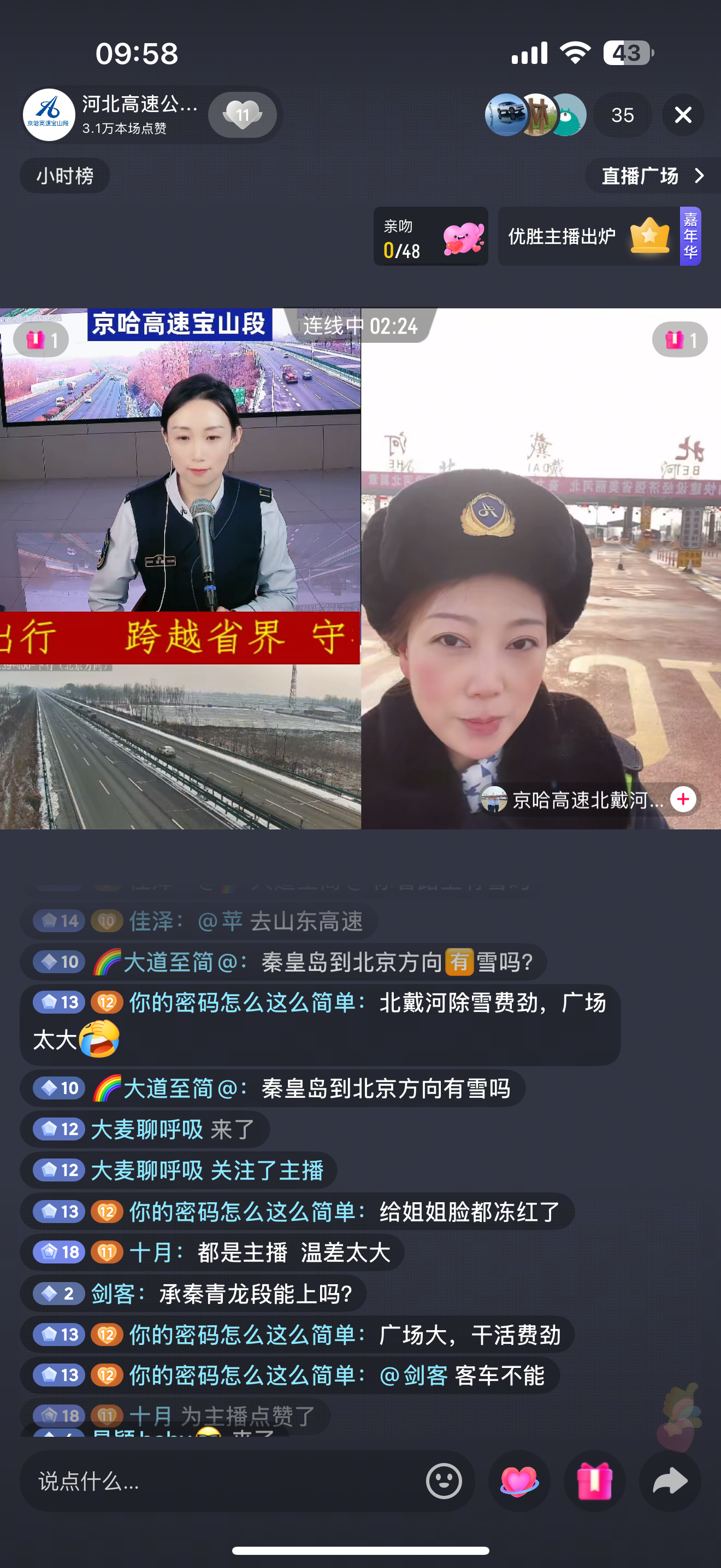 在这场与冰雪的持续“奋战”中,直播间化身成为出行路途上的“实时信息窗口”。面对急迫的出行咨询,团队昼夜奋战,累计解答粉丝关切问题约1万条,覆盖路况、站口管制、安全提示、除雪进度等方方面面,直播总场观人数超50万人次,成为司乘人员不可或缺的信息源。镜头前,主播声音已略显沙哑,但播报依旧清晰、回应始终及时,通过屏幕传递着温暖与安心。