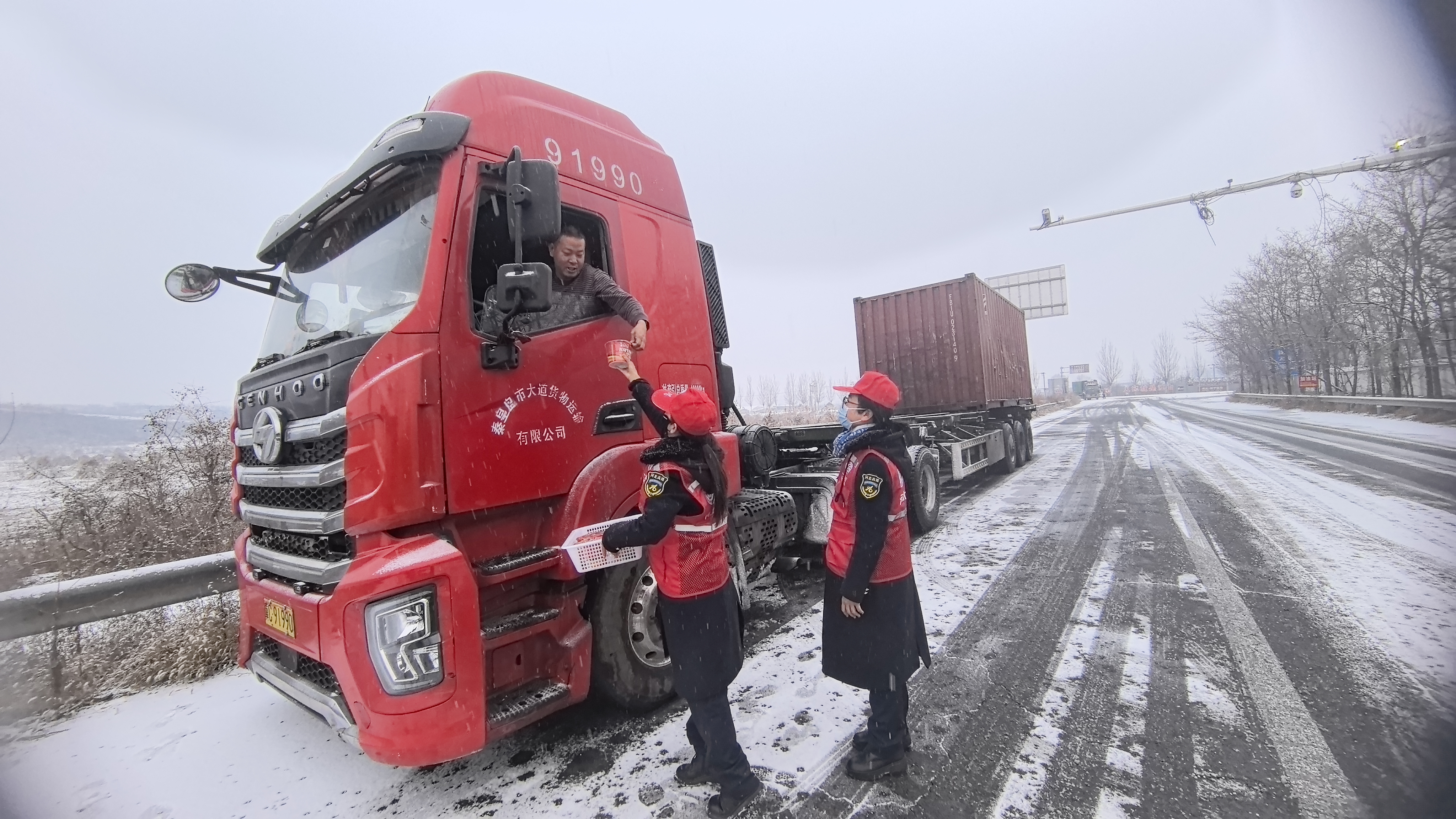 清晨,抚宁北收费站“一路同行”志愿服务队迅速集结,启动应急预案。他们拎起热水壶,抱起整箱的泡面,穿梭在滞留的车流中。志愿者们将一杯杯热气腾腾的开水递到司机手中,为有需要的司乘泡好一碗碗方便面。