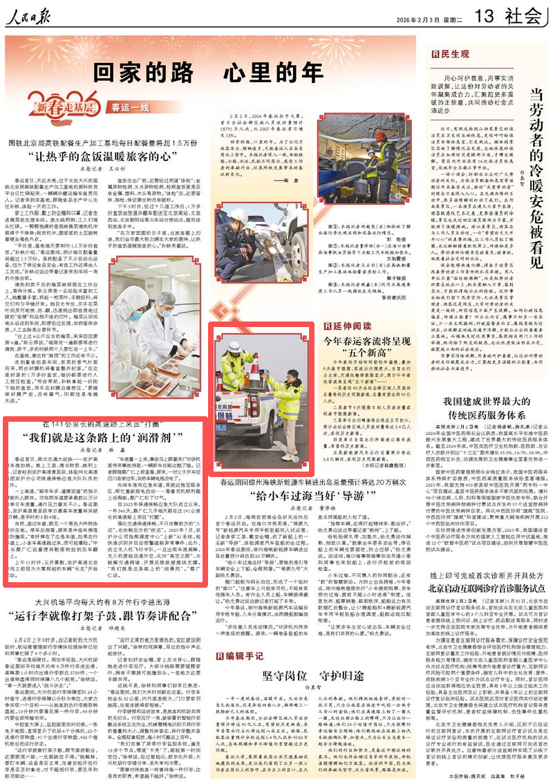 2月3日,《人民日报》头版报眼栏目刊发“春运首日的四组镜头”(新春走基层)图文报道,并在第13版“回家的路 心里的年”(新春走基层·春运一线)刊发了京沪分公司春运保通保畅工作的综合稿件。