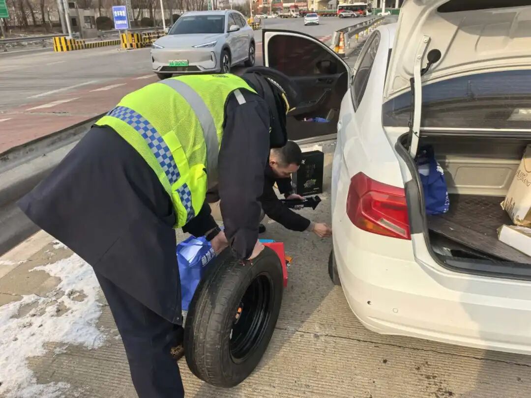 2月16日中午,大队巡查至宣大高速 K204+500 处,发现一辆白色私家车停靠应急车道,车主一家神色焦急。经询问,该车右后轮胎破损漏气。巡查人员立即做好安全预警,一边疏导过往车辆,一边熟练拆卸故障轮胎、更换备胎,短短十几分钟便完成操作。考虑到备胎不适合长途行驶,工作人员又指引其前往就近维修厂修复破损轮胎,确保车辆正常通行。