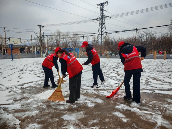 活动现场,积雪覆盖的广场上,志愿者们分工协作、默契配合,手持铁锹、扫帚、垃圾袋等工具,铲除积雪、清扫浮冰,重点清理广场出入口和休闲步道,保障村民出行安全;同时捡拾散落的烟头、纸屑等垃圾,不放过任何一处细节。忙碌的红色身影与皑皑白雪交相辉映,成为学雷锋纪念日里一道温暖的风景线。