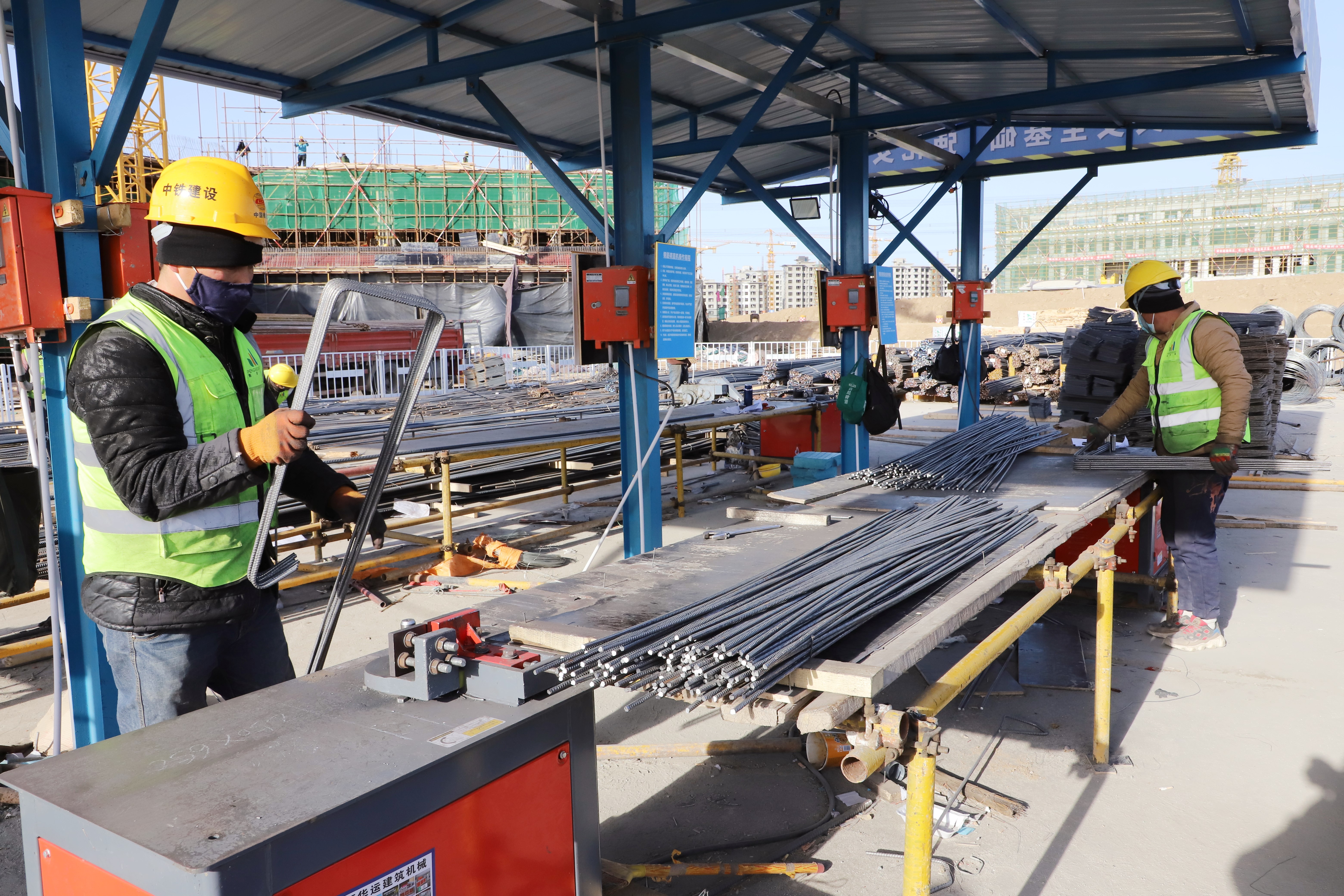 FJ2标施工人员进行钢筋绑扎作业