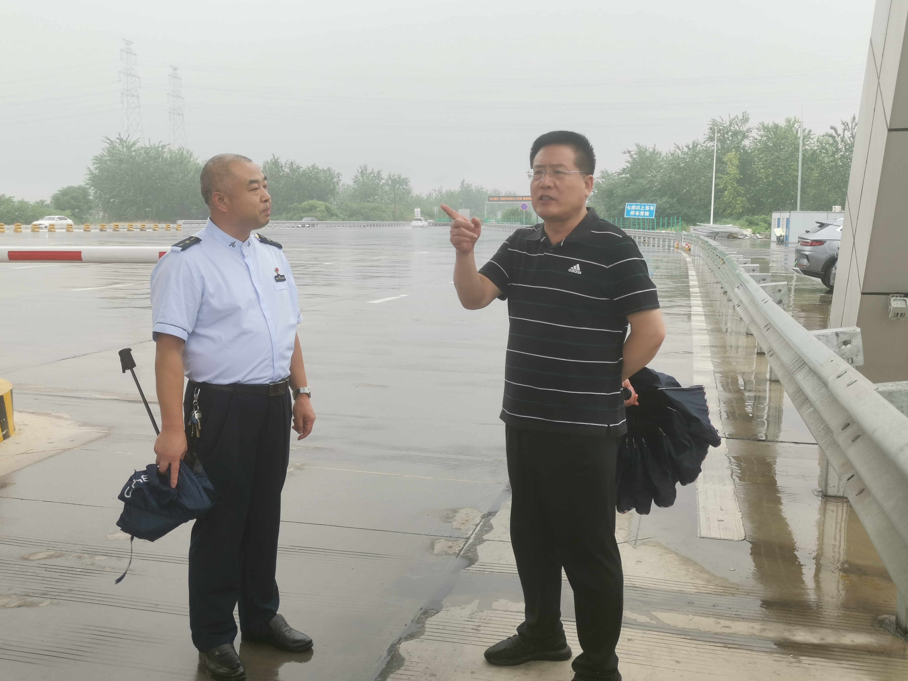 7月29日下午,集团公司副总经理崔士伟冒雨到石安分公司石家庄南收费站督导检查防汛工作。