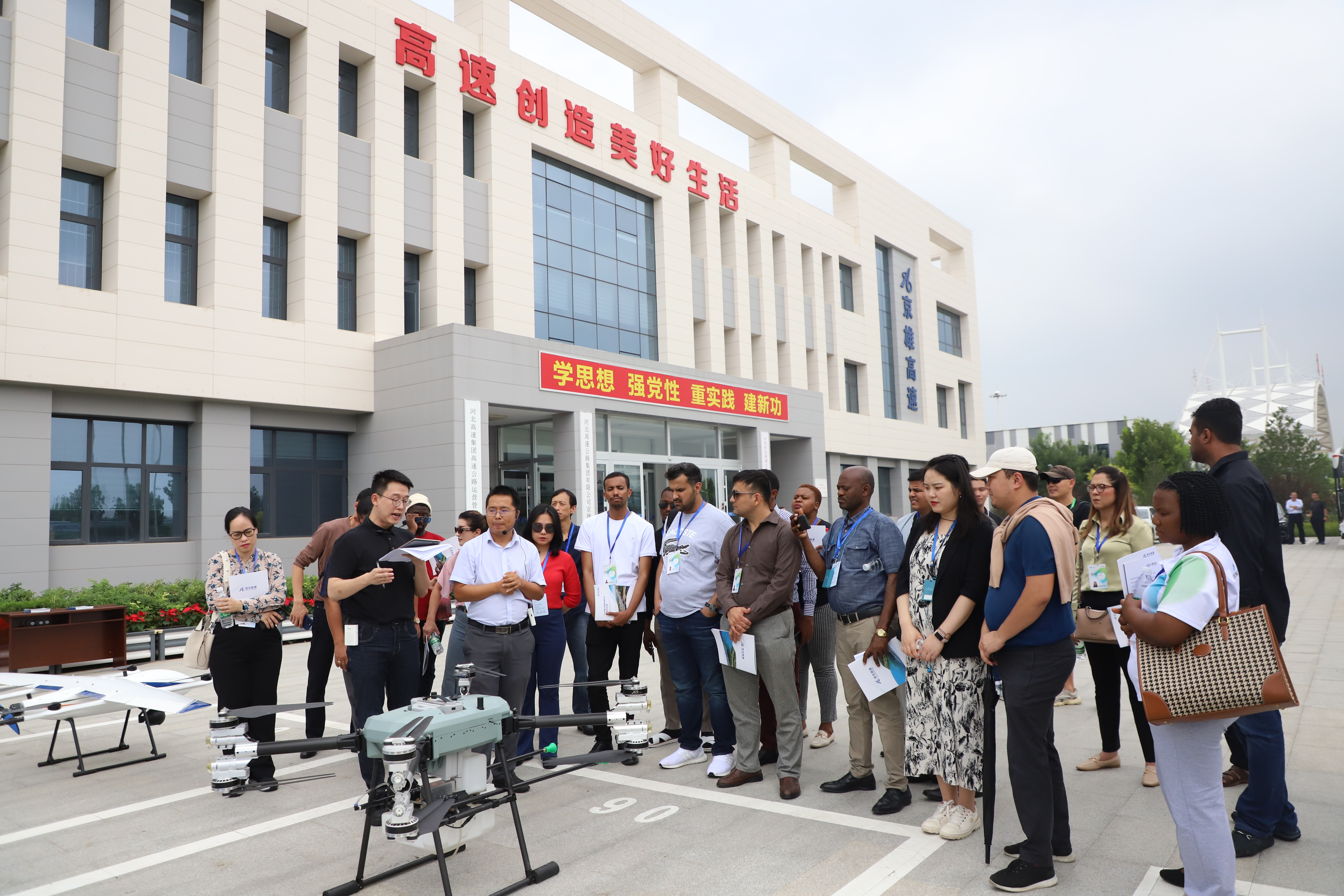 有关专家学者参观了京雄高速工程概况、智慧工程及智慧高速软件平台亮点中英文展板内容,观看了京雄智慧高速建设中英文展示片,详细了解京雄高速在智能化服务、信息化管理方面取得的经验做法和特色亮点。现场听取了讲解员关于京雄高速监控中心云数据中心、智慧管理平台、设备感知数字化、智慧照明、综合运维、智能收费、全媒体融合调度等智慧管控功能介绍,全面系统地了解京雄高速车路协同、自动驾驶专用车道等多项智慧成果。并听取了冀翔通公司高速公路隧道应急处置无人系统、高速公路智能清洗无人系统、高速公路路面日常巡检复合翼无人系统、高速公路桥梁巡检与病害智能识别无人系统等展板内容介绍,实地参观了有关无人机设备。