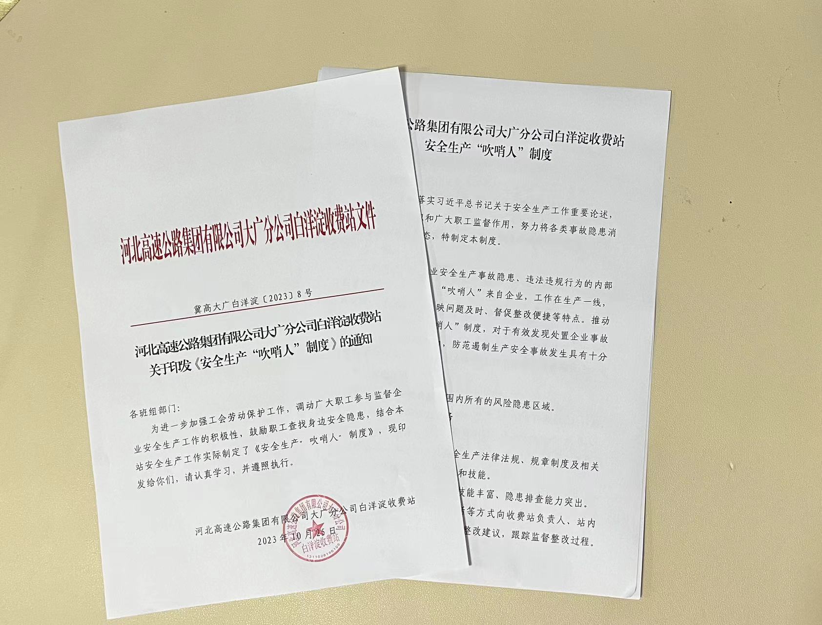 为深入贯彻落实习近平总书记关于安全生产工作重要论述,充分发挥工会组织和广大职工监督作用,大广分公司白洋淀收费站认真贯彻落实河北省总工会《关于推动建立企业安全生产“吹哨人”制度的通知》精神,结合工作实际,近日印发实行了《大广分公司白洋淀收费站安全生产“吹哨人”制度》。
