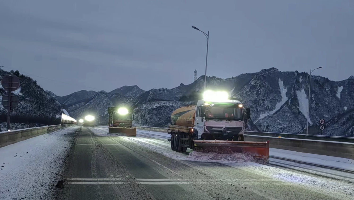 雪情就是命令,保通就是责任。雪情出现后,承德分公司充分发挥“路警一体化”职能,立即启动恶劣天气应急预案,高速、养护、交警、路政等各方联勤联动、高效呼应、快速处置。第一时间组织人员上路开展除雪保畅工作,重点针对桥梁、互通、长大纵坡等部位,增派巡查车加强路面巡控,并采取“机械为主,人工辅助”的方式,迅速撒布融雪剂,及时清扫、铲除积雪。承德高速联合指挥调度中心及各隧道管理站不间断对各路段进行监控视频轮巡,并通过电话、微信、联动工作群以及沿线可变情报板加强各单位、各部门及各路段之间的信息共享,同时利用抖音号、微信公众号、广播等多渠道及时上报和发布路况雪情,确保应急突发事件快接快处。此外,各保通保畅应急大队在关键点位随时待命,遇突发事件立即反应、快速处置。所属收费站组织职工对收费车道、广场积雪进行清理,安排专人为过往车辆及司乘提供路况咨询、路线指引等服务,备足开水、药品及修车工具等,为寒冬中过往司乘送上温情服务。