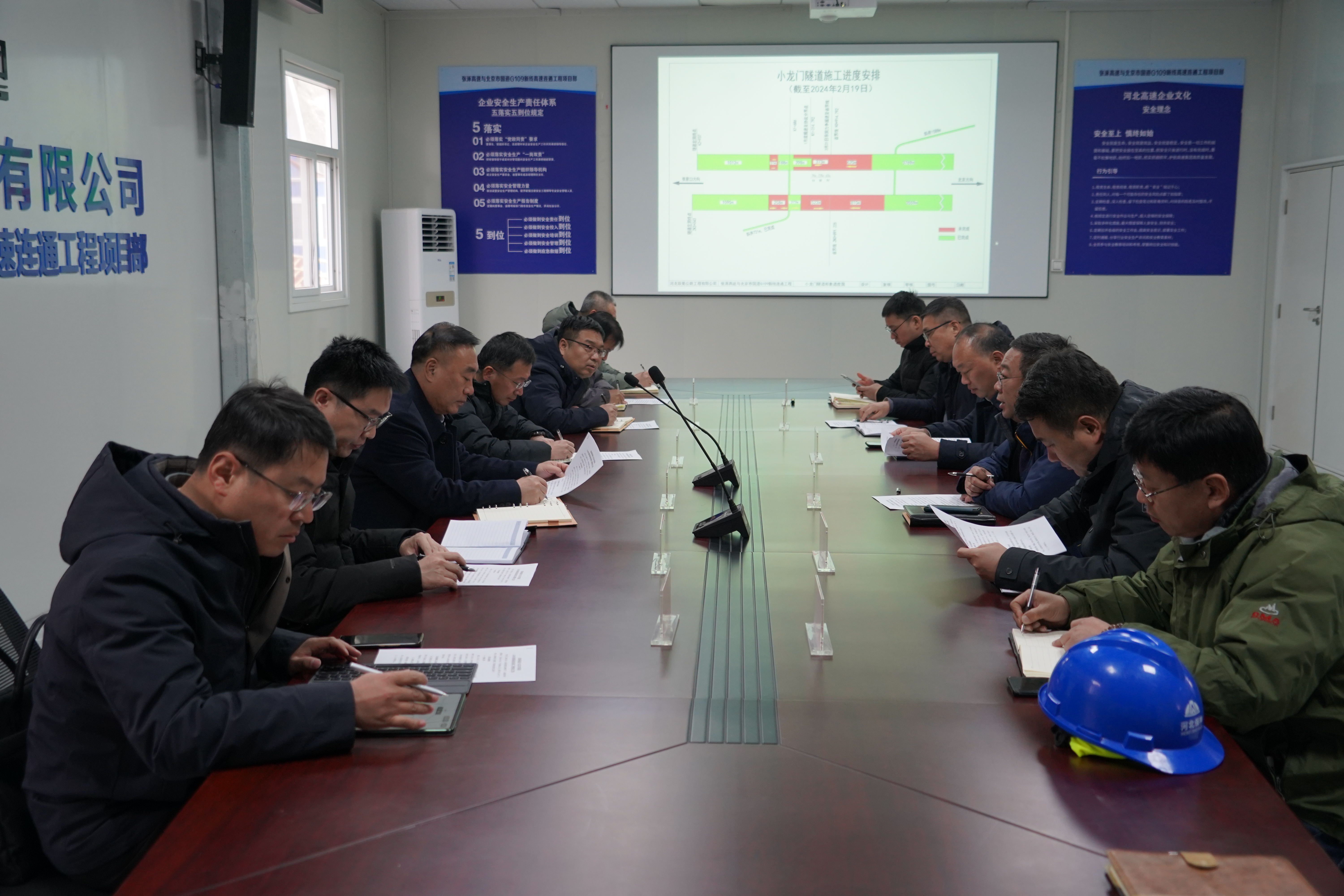 杨荣博要求,一是提高政治站位,强化大局意识,G109新线高速连通工程是京津冀协同发展交通一体化重点项目,是省委省政府重点关注项目。各参建单位要高度重视,凝聚共识,汇聚力量,全面推进工程建设,实现首季“开门红”。二是理清思路,精准破题。仔细梳理隧道每道工序,精准找到症结,逐一破解,优化工序,优化施工,加快推进工程进度。三是锚定目标,靶向发力。要紧盯关键节点,高效推动,强化内外协调,形成工作合力,全面加大隧道人力、物力的投入,着力解决项目建设中技术难点,制定专项方案,确保按时间节点完成既定任务目标。四是加强安全管理,筑牢安全防线。全国“两会”将至,要进一步增强安全意识、责任意识和忧患意识,时刻绷紧“安全弦”,落实安全生产责任,规范安全作业行为,深入推进项目“平安工地”建设。五是抓好工程质量,打造精品工程。按规范施工,把好原材料关、施工关、验收关,严格现场监督监理,打造精品工程。