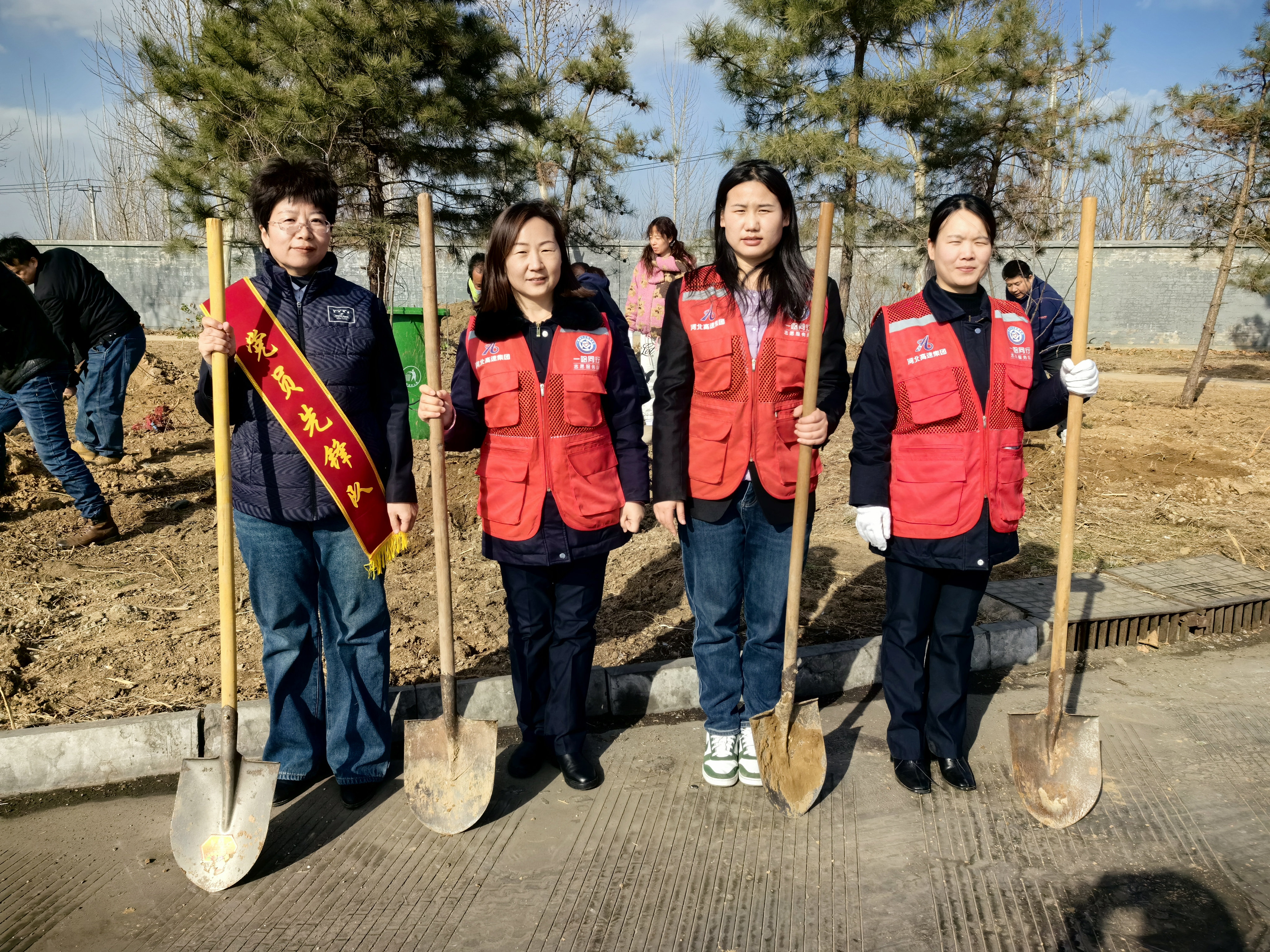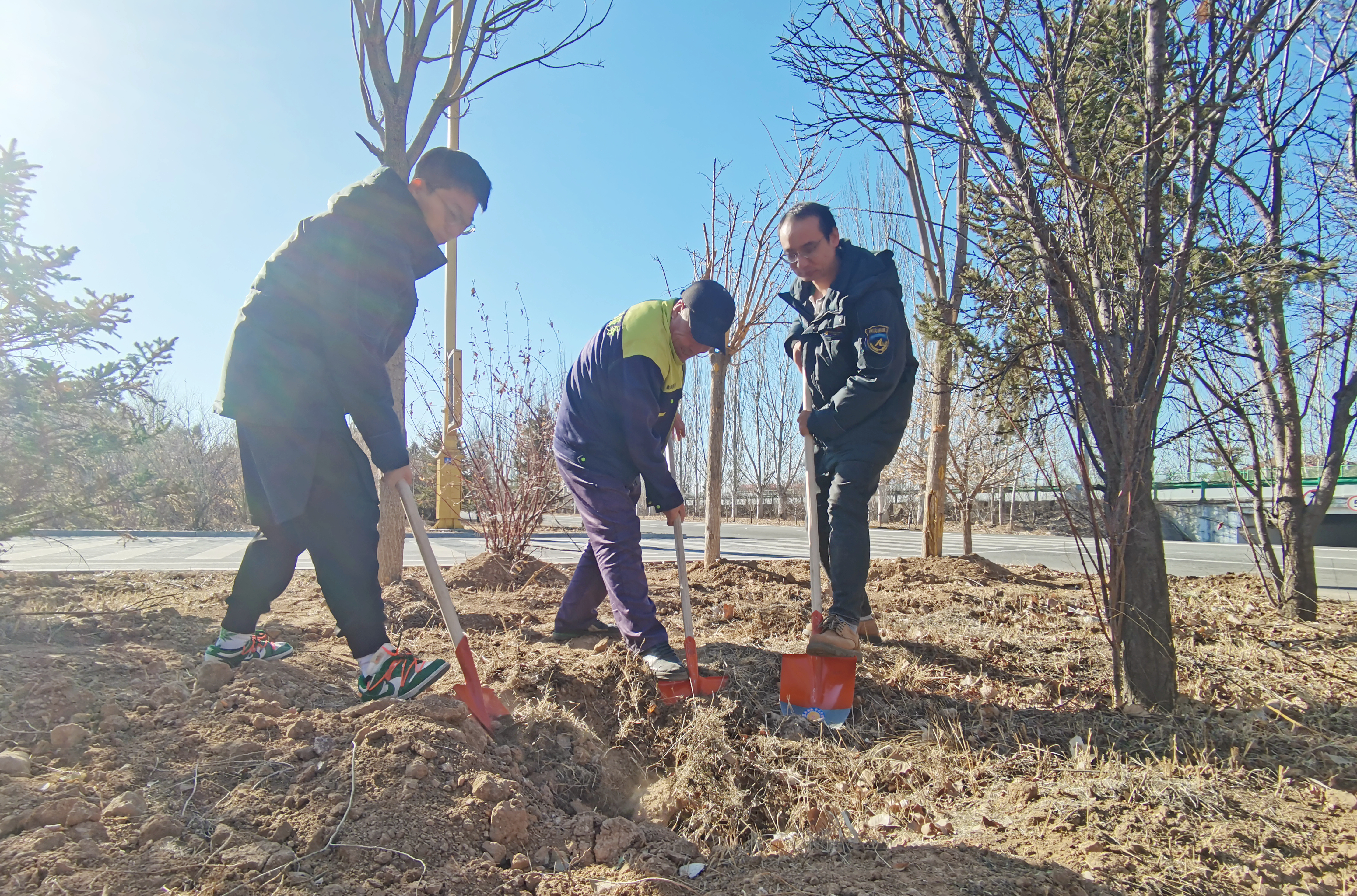破土碎石、挥锹铲土、扶苗填坑、提水浇灌,各服务区一派热火朝天的繁忙景象,广大员工们热情洋溢,有的负责挖坑,有的负责搬运树苗,有的负责培土浇水,共同为服务区增添了一抹抹生机勃勃的绿色。为保证树苗的成活率,每个人都严格按规范操作,一丝不苟做好各道工序,确保植树各环节衔接有序。在大家齐心协力下,一棵棵刺柏、油松被悉心种下,新种的腊梅迎风挺立,馨香扑鼻,焕发一片盎然生机。植树结束后,大家借此机会对此前已有的桃树、杏树、海棠树等进行了修剪、施肥、培土、浇灌,对服务区内的幼小弱病苗木进行新土培植、喷洒农药和返青浇灌,呵护小树成长,助力成材添绿。