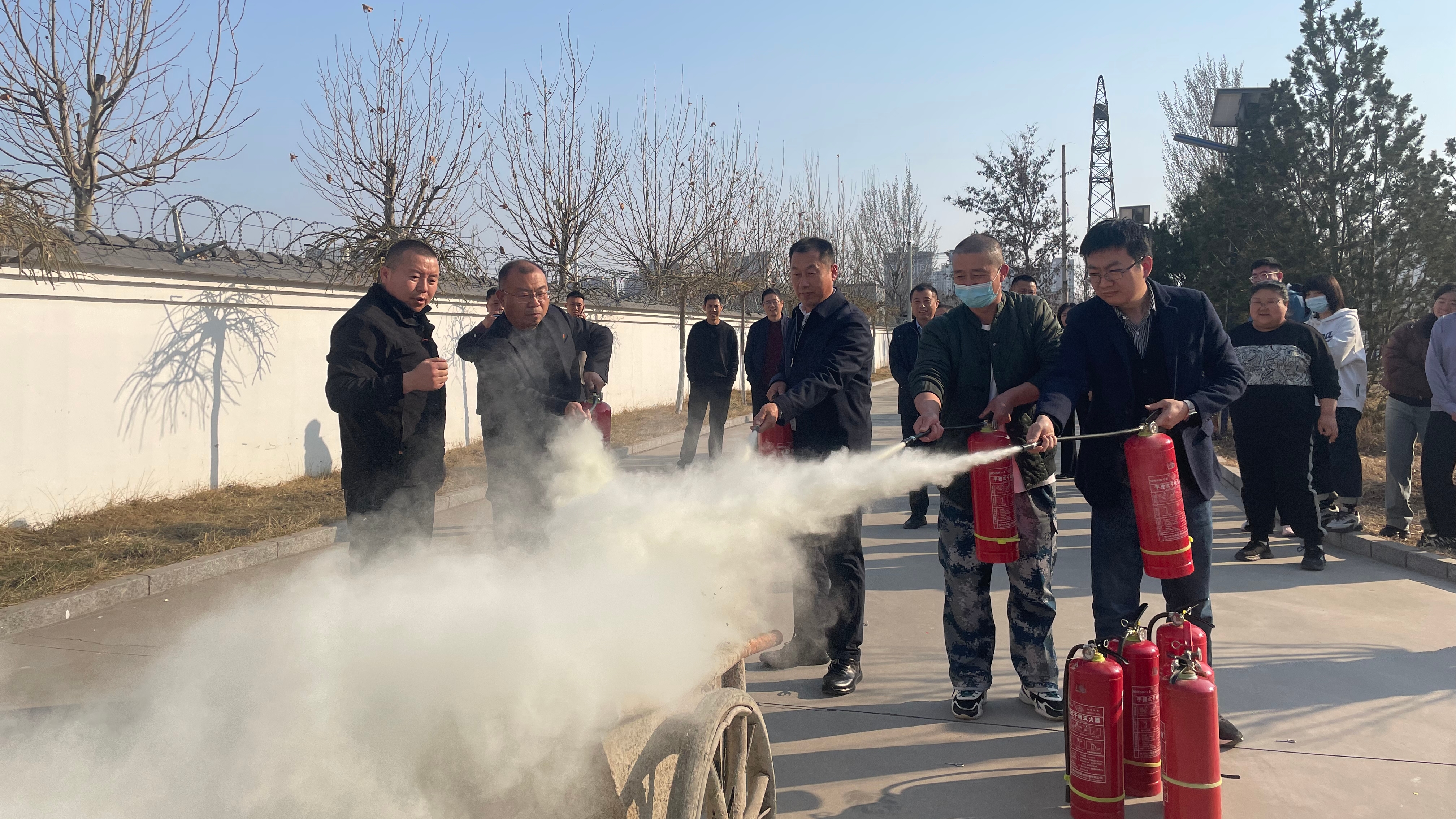培训结束后,所有参训人员参加了消防演练。演练重点讲解了楼道里手动报警器、消防栓水袋的使用,随后进行了楼道里的疏散逃生演习和室外灭火演习。