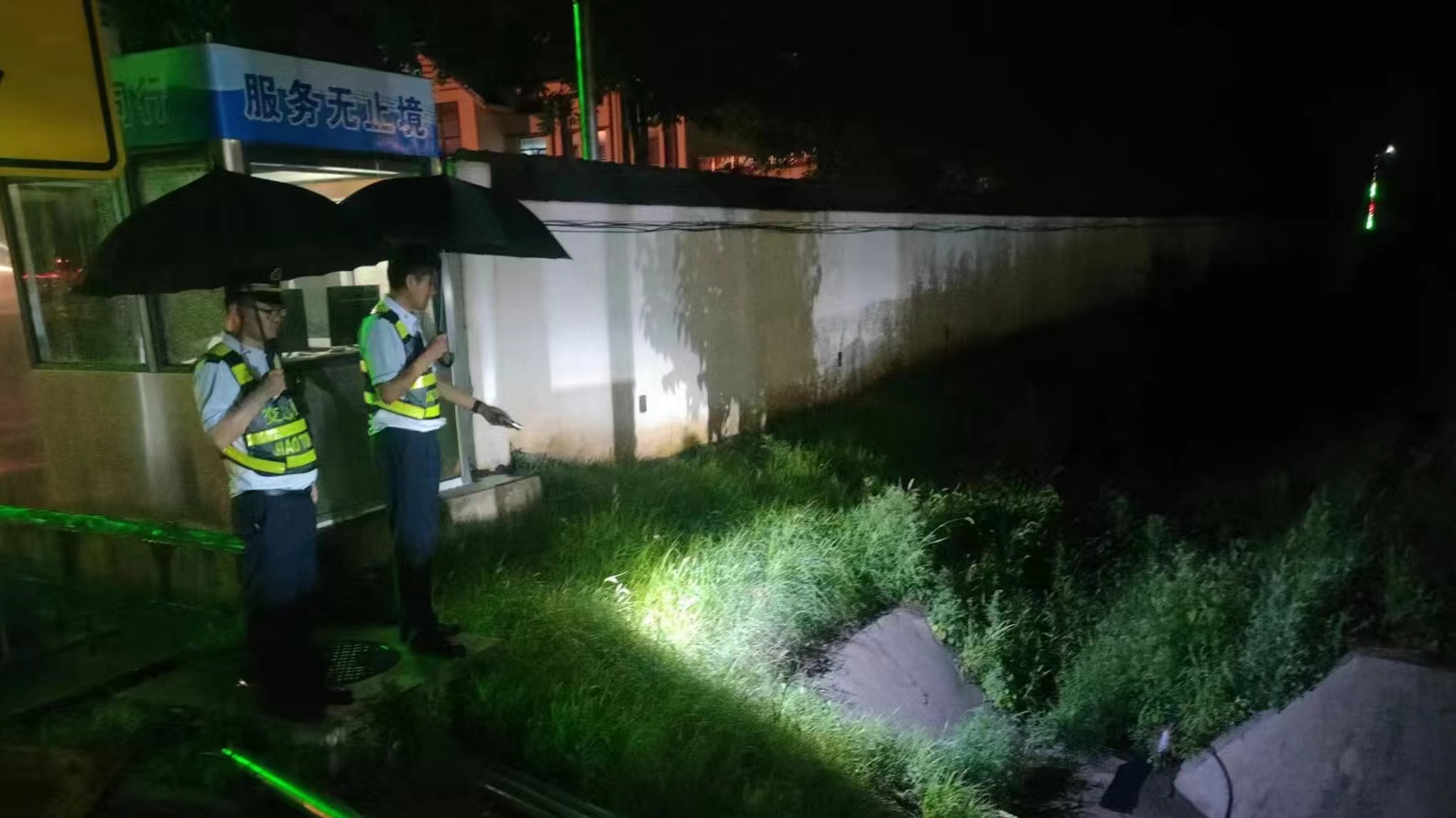 6月13日夜间雷雨天气如期而至,值岗人员冒雨进行雨中巡查。对收费岗亭、收费车道、收费大棚、地下通道的排水情况进行巡查,确保棚顶排水畅通,车道无积水,岗亭无漏水、地下通道无渗水;对庭院进行巡查,确保宿办楼未漏雨、排水通道无淤堵、污水井未外溢;对照明设施、发电设备进行巡查,避免因漏雨造成设备漏电、短路、火灾等安全事故的发生。