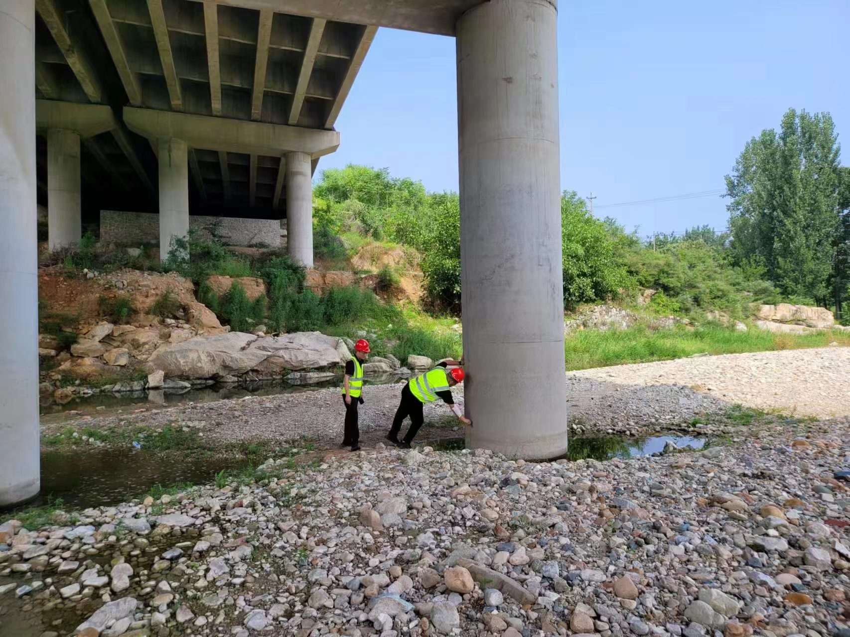 桥梁工程师和外业巡查人员顶着高温烈日、穿过荆棘沟谷深入桥下和边沟,对跨河桥梁墩柱、河道、桥基结合部等重点区域和排水设施开展拉网式排查,对风险隐患做到早发现、早预警、早处置,针对检查发现的问题明确责任人员、制定整改措施、限定整改时限、严格落实整改。截止到日前已排查桥梁50余座,高边坡高填方路基6.2公里。
