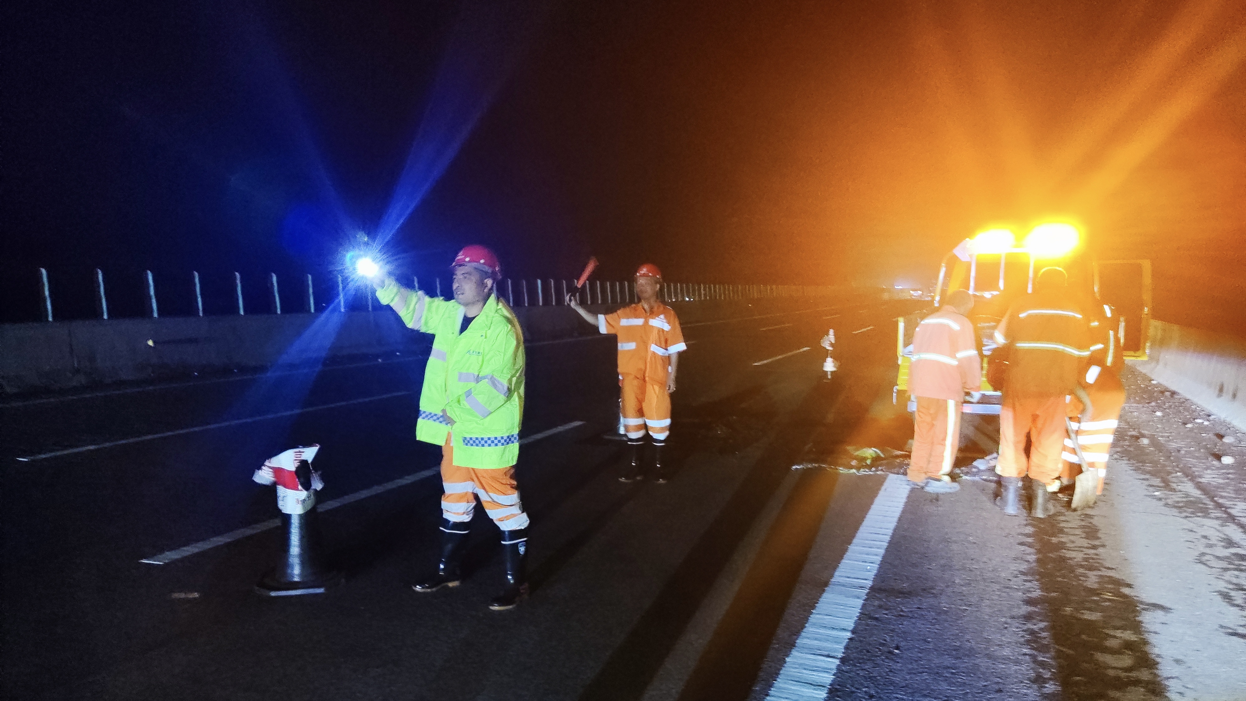 直至深夜23时,养护人员雨中完成桥面、路面10余处坑槽应急处置养护施工,第一时间消除了安全隐患,有效确保了广大司乘通行安全。